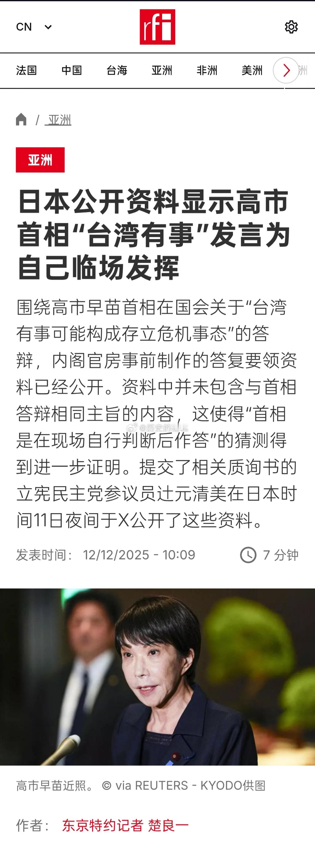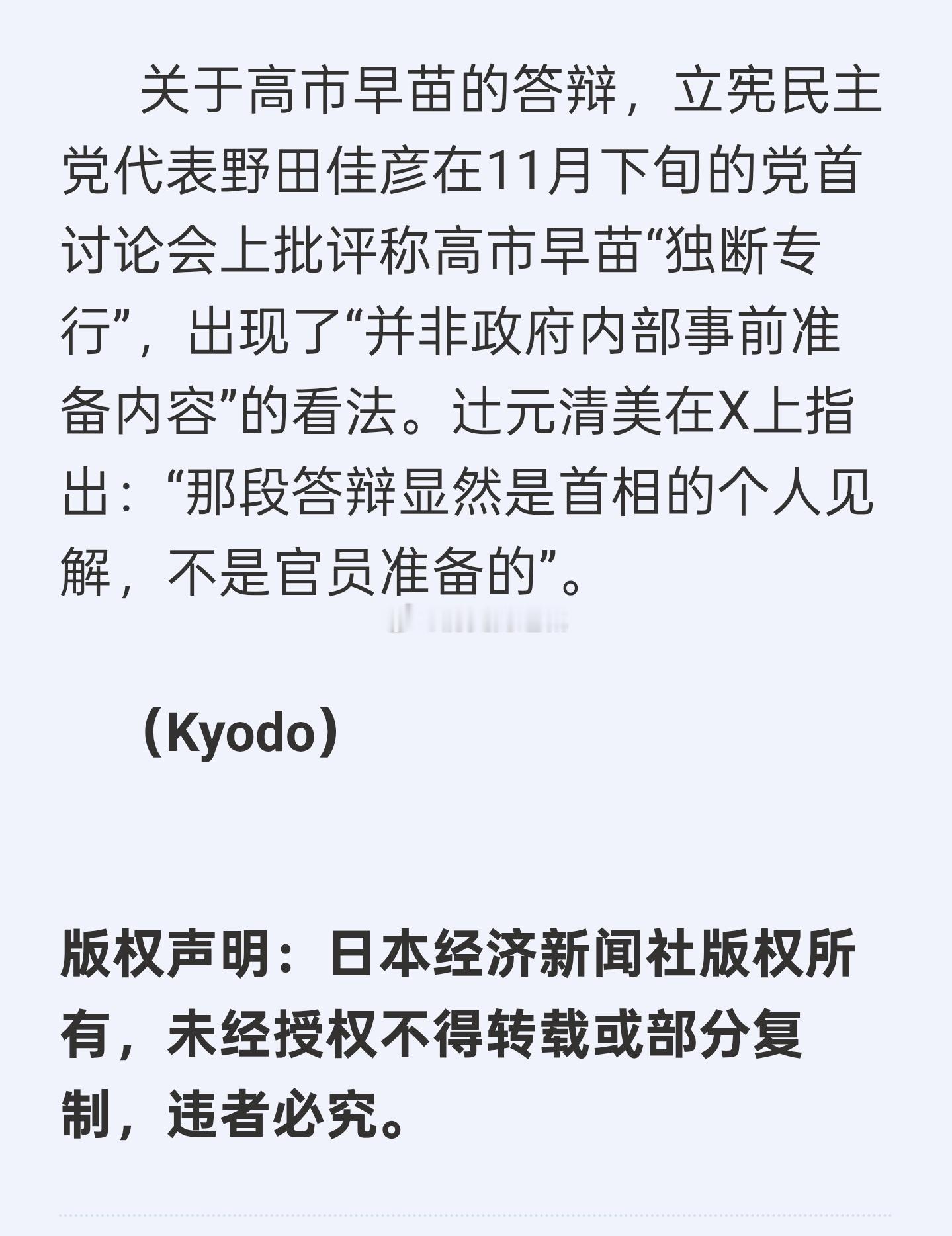 日本立宪民主党参议员辻元清美在社交媒体公开的资料显示,围绕高市早苗在日本国会关于“台湾有事可能构成存立危机事态”的答辩,日本内阁官房事前制作的答复要领资料中并未包含与高市早苗答辩相同主旨的内容,这使得是其“在现场自行判断后作答”的猜测得到进一步证明。对于高市早苗的答辩,立宪民主党代表野田佳彦曾在11月下旬的党首讨论会上批评称高市早苗“独断专行”,出现了“并非政府内部事前准备内容”的看法。辻元清美这在再度指出:“那段答辩显然是首相的个人见解,不是官员准备的”。现在要开始切割了吗?