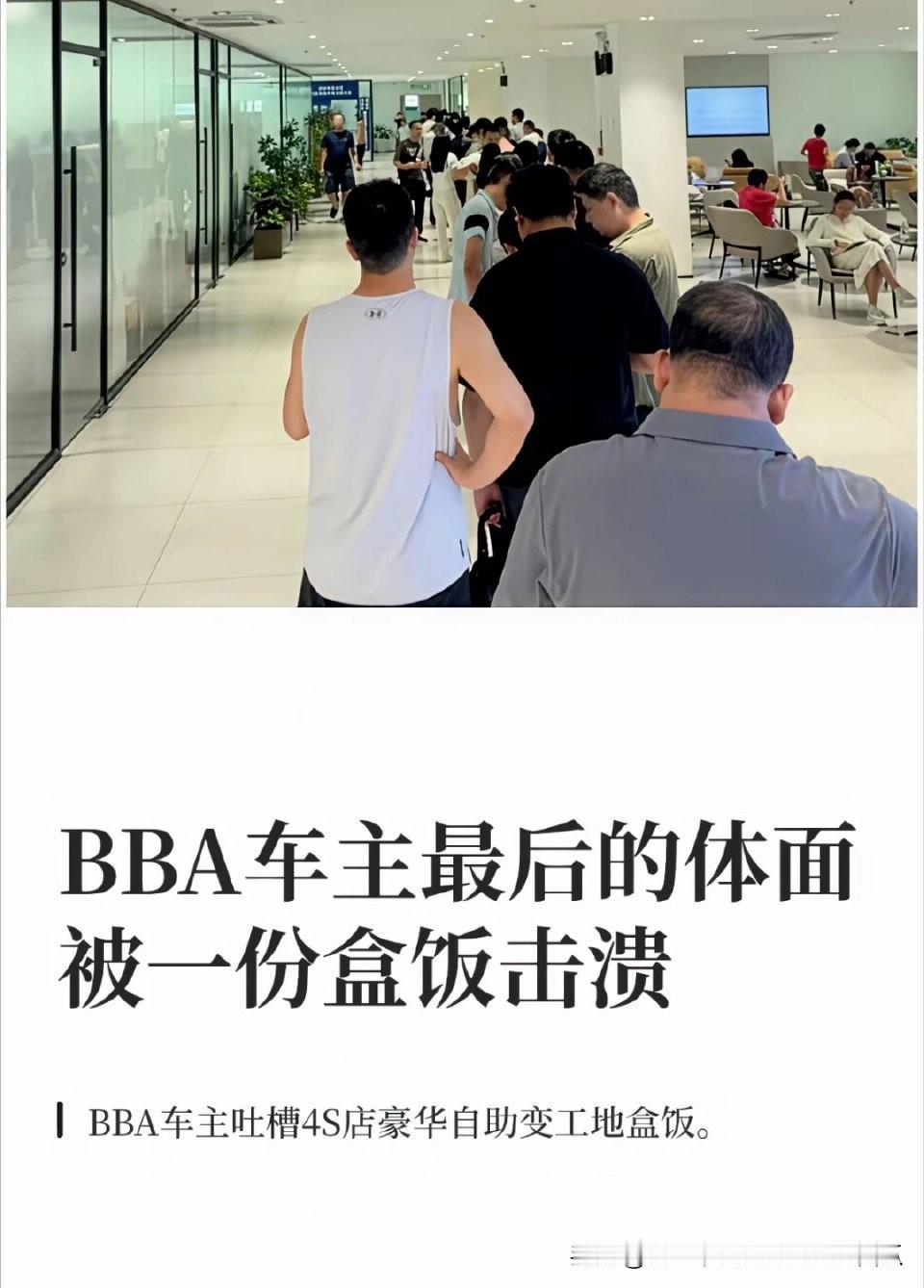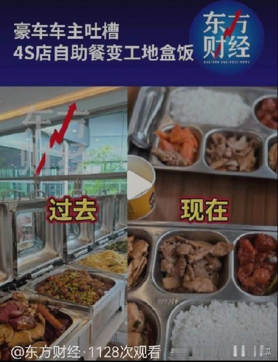 有BBA车主吐槽4S店自助餐变工地盒饭, 其实BBA的餐也没有变得多差, 只是因为接连几年销量上不去, 然后新能源品牌们烧钱也很厉害, 4S店吃得一个比一个好。 所以才让BBA的车主们觉得没那么尊贵了, 其实这个真的没必要, 谁会专门为了吃饭去4S店呢。 4s店食堂