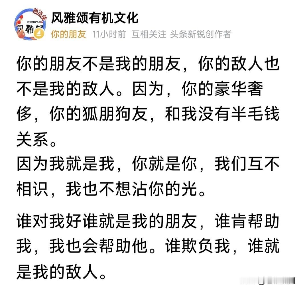谁是我的敌人?谁是我的朋友?请看网友怎么说:这个问题,我心里很清楚,不需要谁来指定!你们告诉我:他们如何如何坏,我都没看见。但我心里绝对明白:谁才是真正的坏人! 还有网友如此解读:你的敌人不是我的敌人,你的朋友也不是我的朋友!因为你的荣华富贵,你的狐朋狗友,和我根本没有半毛钱的关系! 因为你是你,我是我!我们互不相识,我也不想沾你的光。谁对我好,就是我的朋友;谁肯帮助我,我也会帮助他;谁欺负我,就是我的敌人! 朋友这些话,没有高谈阔论,却话糙理不糙,说得很实在!人是感情动物,谁对他好,自然就是他的朋友。谁对他不好,当然就不是他的朋友。 还有谁是敌人和朋友?对于这个问题,也许小孩子们分不清楚,需要家长正确引导。但对于成年人来说,还有哪个分不清?真不需要谁指定啊! …………
