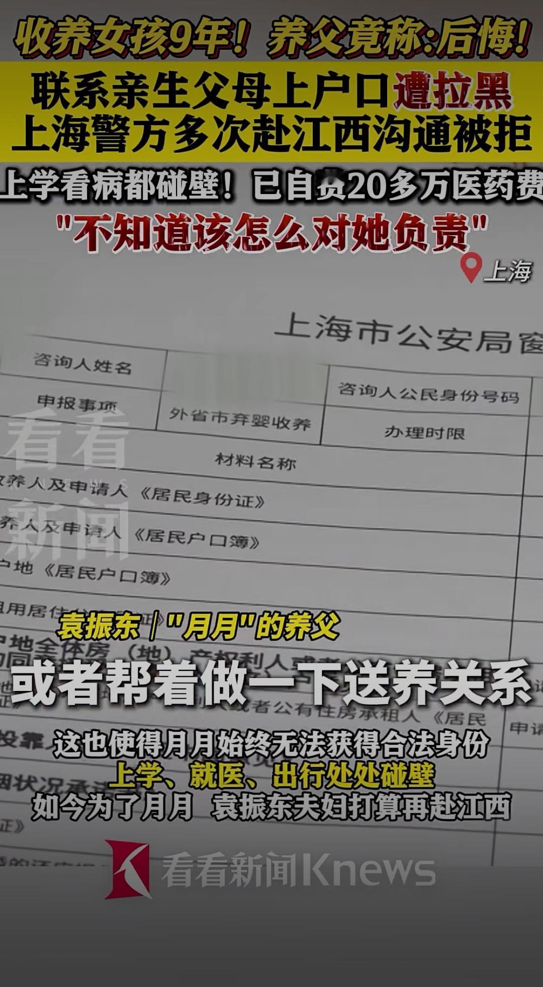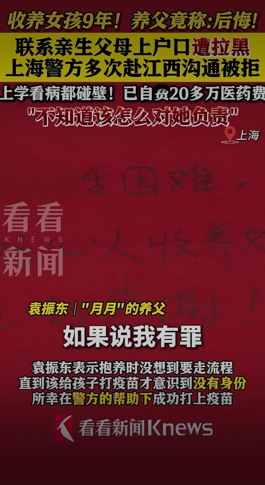 收养女孩9年花20万医药费,养父崩溃喊后悔!亲生父母拉黑失联,谁来给孩子一个未来?真是好人难做 上海一位普通养父的崩溃嘶吼,戳中了无数人的泪点。9年前,他心软收养了这个嗷嗷待哺的女婴,从此把她视若己出,9年里光是医药费就砸进去20多万,把一个病弱的孩子养得健康活泼。可如今,孩子到了上学的年纪,没有户口寸步难行,看病报销更是奢望,养父彻底陷入了绝望。 为了给孩子上户口,他四处奔波联系女孩的亲生父母,对方却直接拉黑失联;上海警方多次远赴江西协调沟通,亲生父母依旧闭门不见,铁了心要甩掉这个“包袱”。一边是养父掏心掏肺的9年养育情,一边是亲生父母冷血无情的逃避,两相对比,让人寒彻骨髓。 养父哽咽着说“不知道该怎么对她负责”,这话里藏着多少无奈?他不是不想负责,是实在扛不住了!没有户口,孩子没法入学,没法正常就医,未来更是一片迷茫。20多万的医药费,是他省吃俭用的血汗钱;9年的朝夕相伴,是他割舍不下的父女情。可如今,他就像一个被架在火上烤的人,进退两难。 网友看了纷纷破防:“亲生父母枉为人!”“好人怎么就这么难?”是啊,法律规定收养需办理正规手续,可这位养父当初的善意之举,怎么就变成了如今的烫手山芋?更让人揪心的是,孩子何其无辜!她没选择自己的出身,却要为亲生父母的逃避买单,要跟着养父一起承受这无妄之灾。 这起事件,撕开了收养制度里的一道裂缝,也拷问着人性的底线。善良不该被辜负,孩子更不该被抛弃。希望相关部门能伸出援手,帮这对苦命的父女找到出路,也盼那些逃避责任的亲生父母,能早日良心发现。你觉得该如何帮这个孩子解决户口难题?快来评论区出出主意!