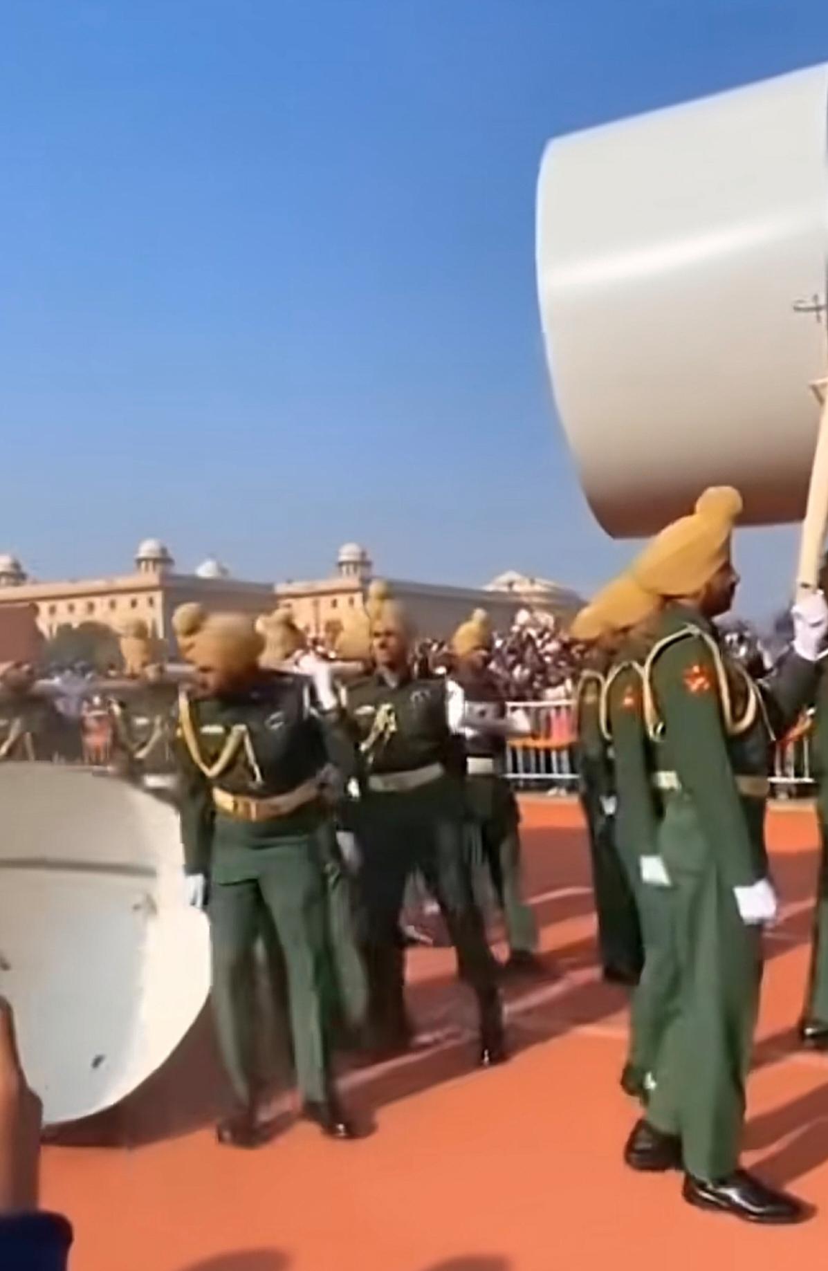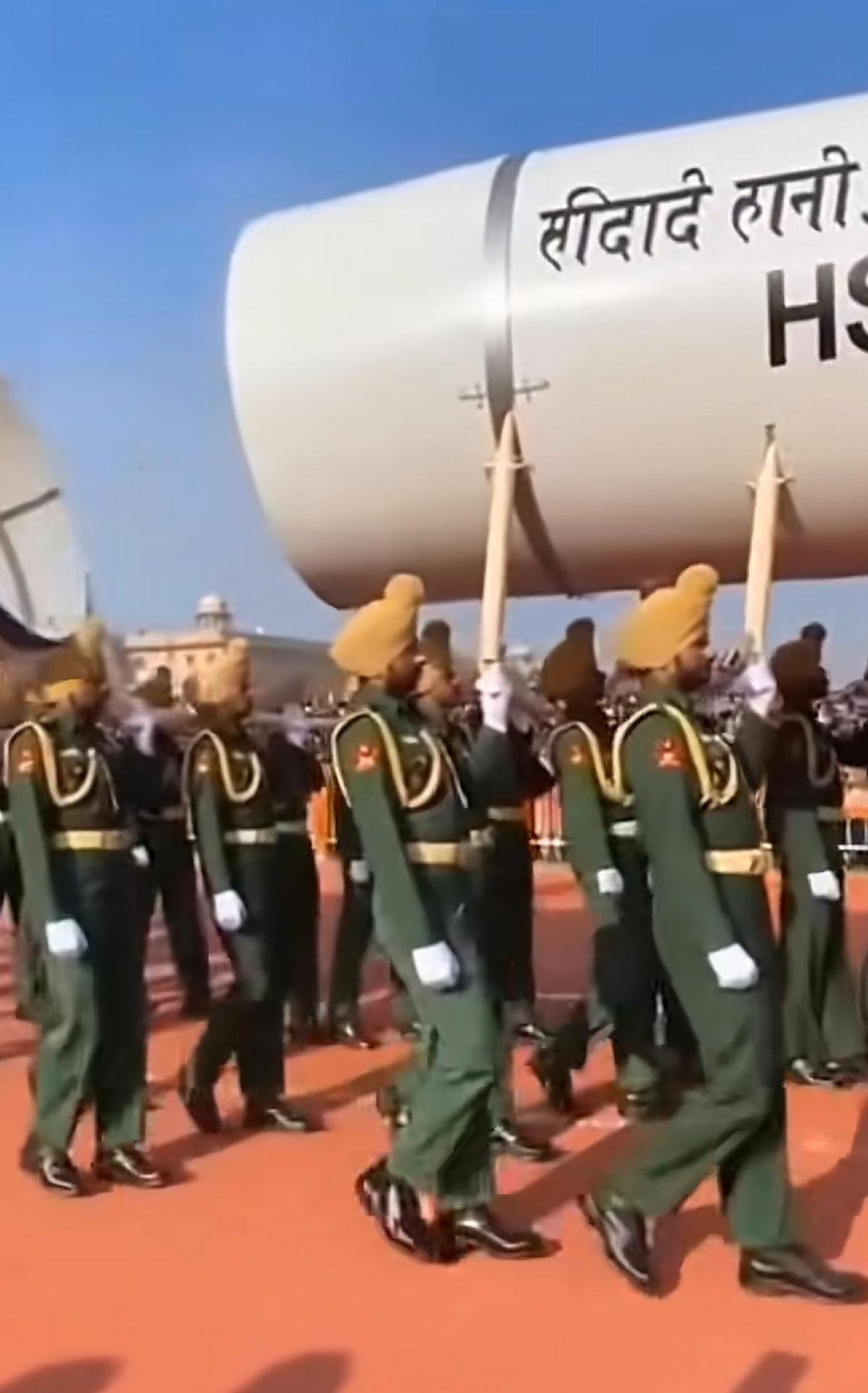印度阅兵还是很幽默的,一群人抬着导弹走向检阅台。这个导弹看起来,还是挺大的,挺威武的。但是,突然尾巴就掉落了。难道这是最新研究成果?话说他们的导弹真的很轻便,轻轻松松就能抬着去阅兵。我想在这项技术上,世界上无人能及。