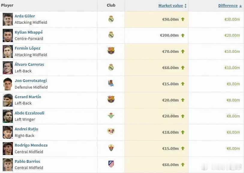 西甲球员身价变更:亚马尔、姆巴佩2亿欧并列第一,7人身价上亿北京时间12月12日