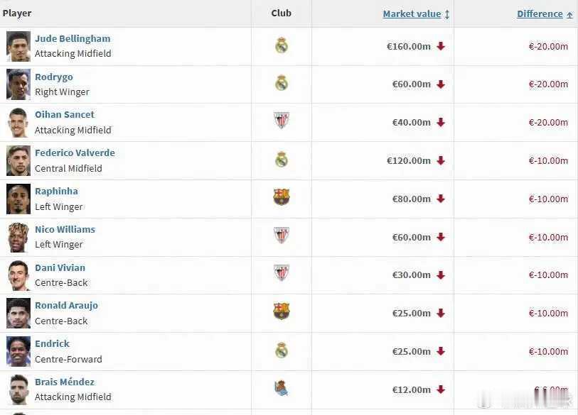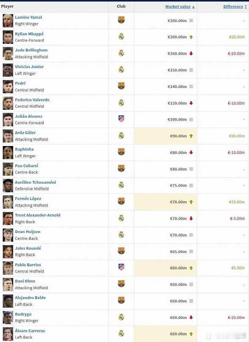 西甲球员身价变更:亚马尔、姆巴佩2亿欧并列第一,7人身价上亿北京时间12月12日,德国转会市场公布了最新一期西甲球员身价。亚马尔、姆巴佩2亿欧并列第一,7人身价上亿。本次身价更新中,亚马尔身价保持不变,仍为2亿欧。姆巴佩身价上涨2000万欧,与亚马尔并列第一。贝林厄姆身价下跌2000万欧,跌至1.6亿欧元,位列第三。维尼修斯和佩德里身价保持不变,分列第四、第五。巴尔韦德身价下跌1000万欧,身价来到1.2亿。阿尔瓦雷斯身价保持不变,保持在1亿关口。这样,本次身价更新后,西甲有七位球员身价上亿。西甲身价TOP20西甲身价涨幅前十西甲身价跌幅前十
