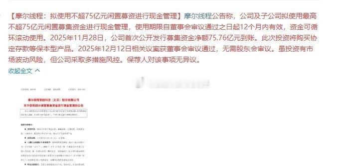 太新鲜了!摩尔线程:拟使用不超75亿元闲置募资进行现金管理,此次投资将购买协定存款等保本型产品。不缺钱的来圈钱,圈了钱,买理财。75亿资金,2个点利息,一年利息1.5亿,比公司利润都多,比A股5000多家公司绝大多数利润都多。
