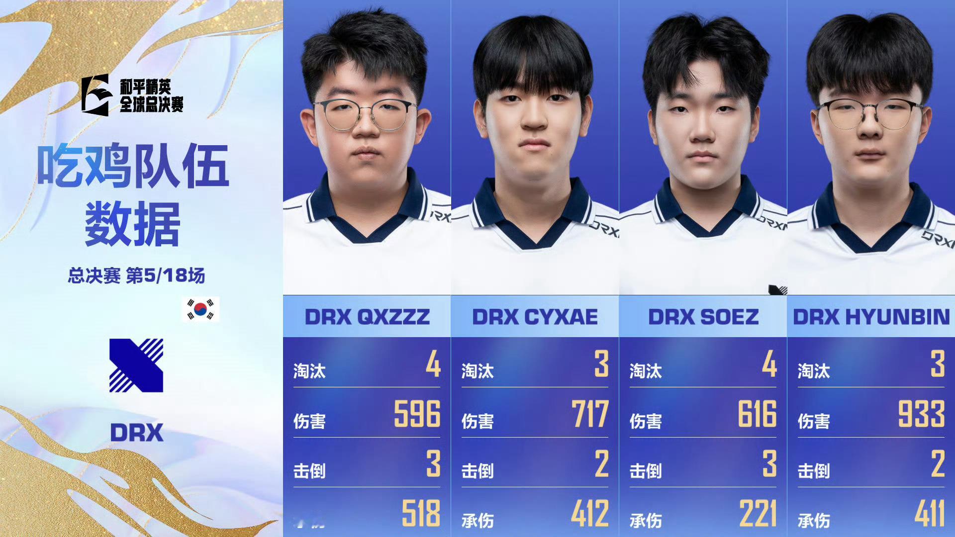 和平精英世界赛决赛揭幕战TT登场全球总决赛 【2025和平精英全球总决赛】决赛 Day1 第五场获胜队伍:DRX战队MVP:DRX·SOEZ截至本场总积分榜第—名:DX战队第二名:DRX战队第三名:截至本场淘汰榜第—名:REG·LOXY第二名:REG·WiLD第三名:APG·TOP第四名:APG·REFUS