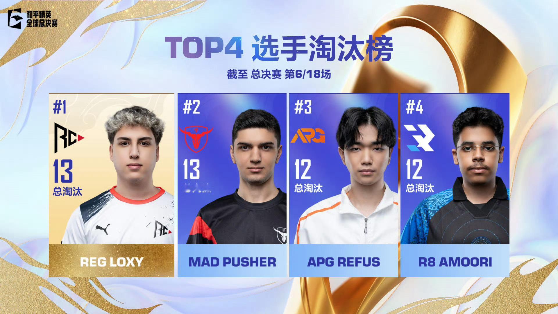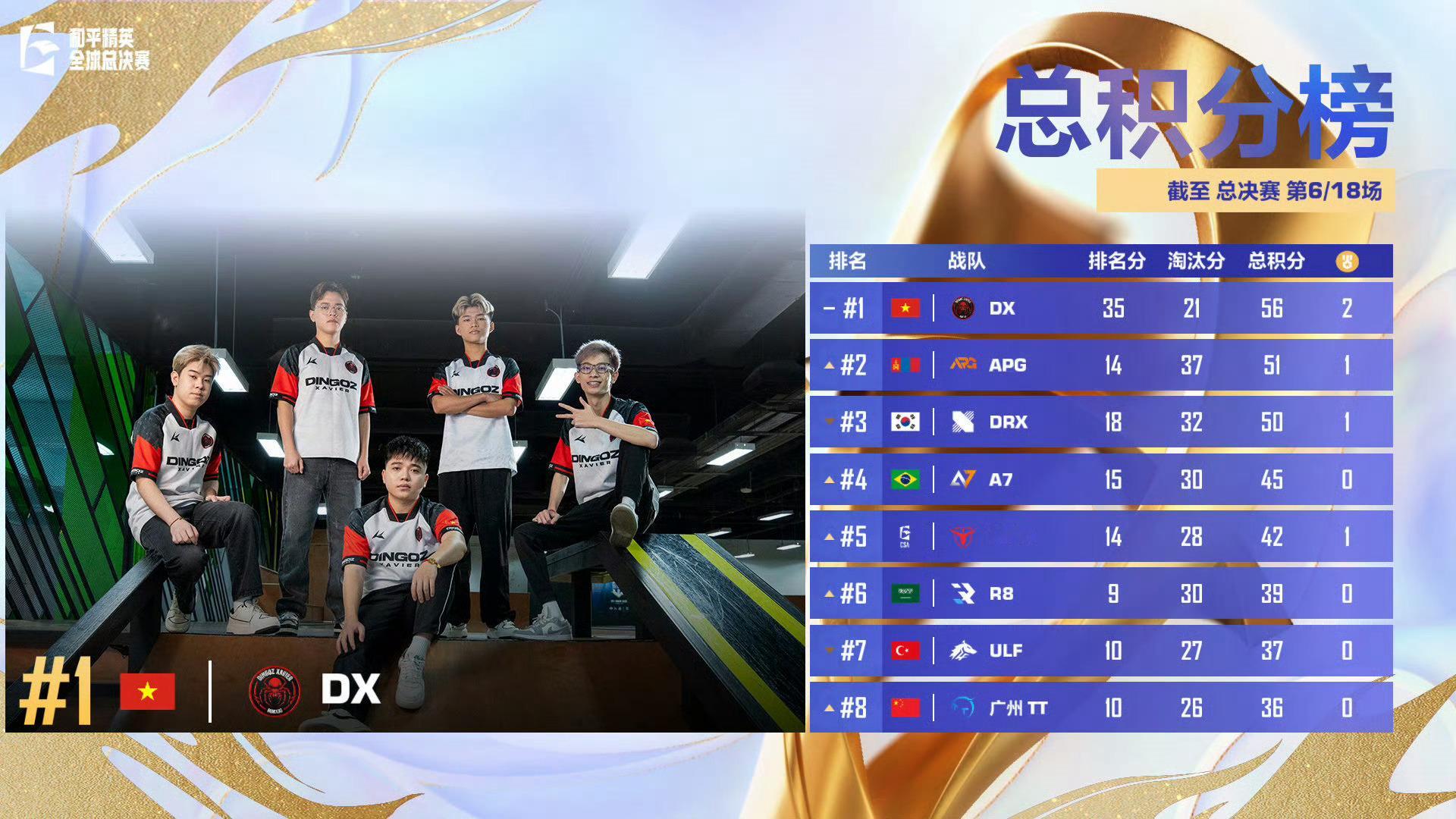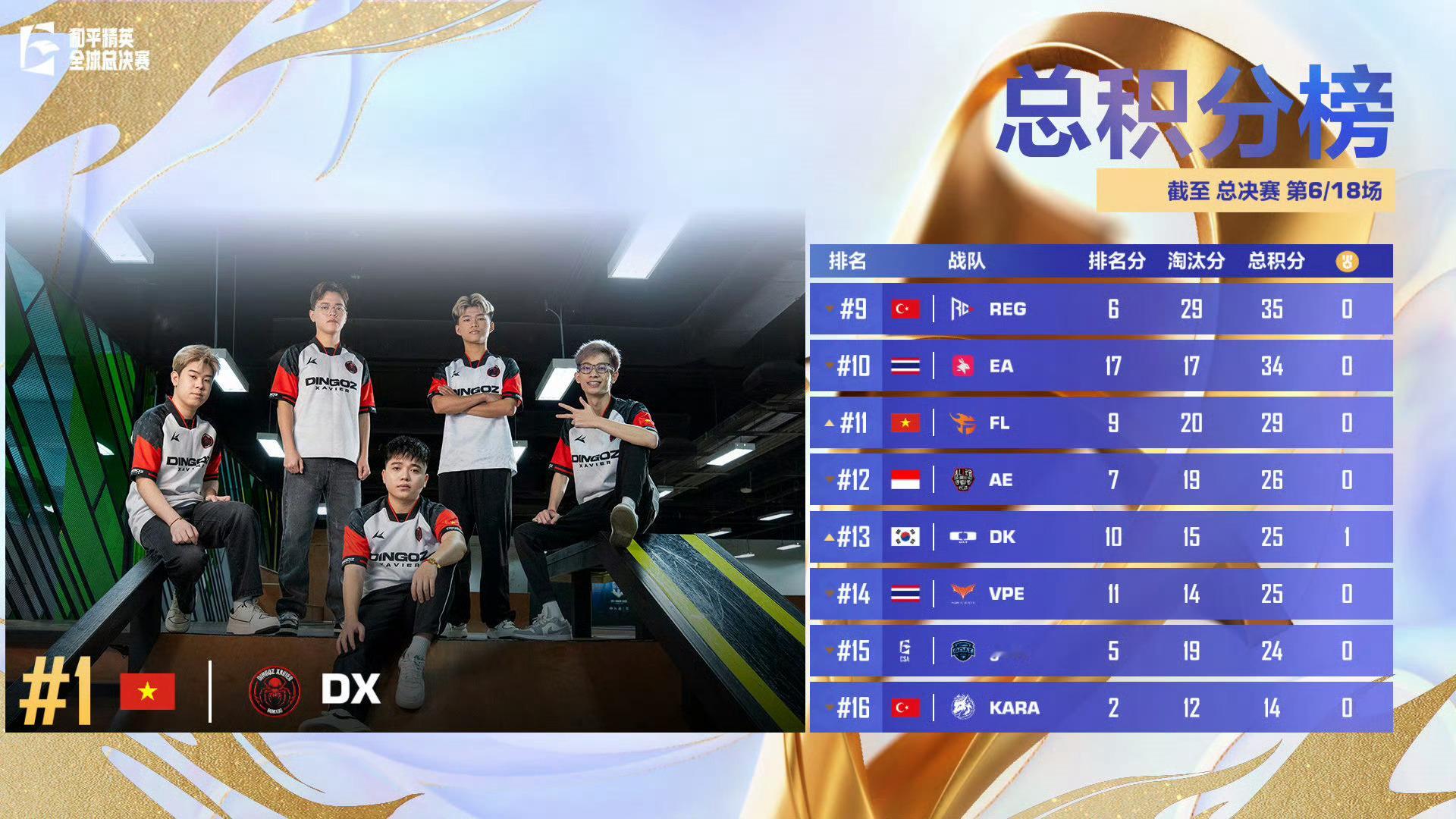 和平精英世界赛决赛揭幕战TT登场全球总决赛 分享图片【2025和平精英全球总决赛】决赛 Day1 第六场获胜队伍:DK战队MVP:DK·OSAL截至本场总积分榜第—名:DX战队第二名:第五名:MAD战队截至本场淘汰榜第—名:REG·LOXY第二名:MAD·PUSHER第三名:APG·REFUS第四名:R8·AMOORI