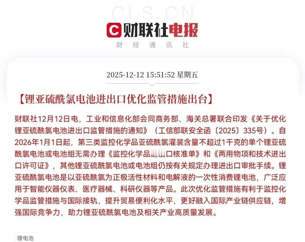盘后重磅利好!锂亚硫酰氯电池出口“松绑”,18只概念股全产业链受益政策红包往往在盘后送达!2025年12月12日,工信部、商务部、海关总署联合出台锂亚硫酰氯电池进出口监管优化政策,明确自2026年1月1日起,单只或每组灌装亚硫酰氯含量≤1千克的该类电池,无需办理《监控化学品进出口核准单》和《两用物项和技术进出口许可证》,其余规格仍按现有规定审批。作为一次性锂电池中的“耐力王者”,锂亚硫酰氯电池能量密度最高可达750Wh/kg,能在-55℃至150℃极端环境稳定工作,存储寿命超15年,广泛应用于智能仪表、医疗器械、物联网终端、军工航天等关键领域。此次政策优化实现监管标准与国际接轨,不仅为占出口总量75%以上的小容量电池打开“全球贸易绿色通道”,更能降低企业通关成本、缩短审批周期(单批次审批时间从15个工作日压缩至3个),助力相关产业深度融入全球产业链,增强国际竞争力,利好电池生产、材料供应、设备制造等全产业链环节。锂亚硫酰氯电池受益概念股全梳理1. 亿纬锂能:国内锂亚硫酰氯电池核心龙头,打破海外企业垄断,布局全系列产品,国内市场份额超70%,应用覆盖智能仪表、物联网等领域。政策落地后,中小容量电池出口流程简化,海外出货效率大幅提升,将进一步巩固并扩大国际市场份额。2. 鹏辉能源:深耕该领域研发生产多年,产品精准适配医疗设备、科研仪器等高附加值场景,海外销售占比可观。进出口监管放松后,中小容量电池出口成本降低,公司有望加速开拓海外高端应用市场,收获更多国际订单。3. 国轩高科:聚焦锂亚硫酰氯电池储能与小型应用场景,具备规模化生产能力,已与海外智能仪器企业建立稳定合作。政策优化后,中小容量电池出口审批简化,将显著提升海外订单交付效率,强化客户合作粘性。4. 中银绒业:旗下锂业板块聚焦锂亚硫酰氯电池正极材料供应,为电池生产提供核心原料支撑。政策推动产业需求增长,公司正极材料订单有望持续增加,同时出口便利化也将带动原料跨境流通效率提升。5. 新宙邦:锂电池电解液领域领军企业,亦是锂亚硫酰氯电池电解液重要供应商,产品性能契合高端应用需求。随着行业需求扩容,公司电解液出货量将随电池生产规模同步增长,海外业务也将充分受益于贸易便利化红利。6. 天赐材料:深耕锂亚硫酰氯电池电解液研发与生产,技术储备深厚,已与多家头部电池厂商达成长期合作。政策优化推动电池出口增长,公司电解液配套需求将同步攀升,海外市场拓展节奏有望加快。7. 多氟多:生产锂亚硫酰氯电池所需氟化物原料,同时涉足电池成品代工业务,保障国内60%以上原料自给。政策利好带动电池产业蓬勃发展,公司原料供应与代工业务将双端受益,海外代工订单审批效率也将显著提升。8. 德赛电池:专注于锂亚硫酰氯电池封装与成品制造,产品广泛应用于智能穿戴、医疗设备等领域,海外客户占比高。中小容量电池出口审批简化后,成品出口流程更高效,合规成本降低,利润空间有望进一步释放。9. 欣旺达:涉足锂亚硫酰氯电池生产,聚焦工业仪器、物联网终端等应用场景,具备成熟的海外渠道优势。政策落地后,公司中小容量电池出口无需额外审批,可快速响应海外客户订单需求,抢占市场先机。10. 珠海冠宇:布局锂亚硫酰氯电池小型化产品,主打消费级智能仪器配套,海外市场布局完善。进出口监管优化后,中小容量电池出口成本下降,将有效提升产品国际性价比,增强海外市场竞争力。11. 维科技术:专注锂亚硫酰氯电池研发,产品适配科研仪器、环境监测设备等场景,正积极拓展海外市场。政策简化出口流程后,公司可加速推进海外市场布局,快速提升产品国际市场占有率。12. 孚能科技:侧重锂亚硫酰氯电池储能型产品研发,为工业储能、智能电网提供核心配套,海外合作项目丰富。政策利好下,中小容量储能电池出口审批提速,公司海外储能订单交付周期缩短,业务增长确定性增强。13. 杉杉股份:锂亚硫酰氯电池负极材料核心供应商,产品性能满足高端电池要求,与头部电池厂商合作紧密。电池产业需求增长将直接带动负极材料需求提升,公司将持续受益于全产业链扩容红利。14. 科达利:主营锂亚硫酰氯电池结构件,为电池生产提供关键零部件,客户涵盖国内外主流电池企业。政策推动电池出口增长,电池产能加速释放,公司结构件配套订单将同步增加。15. 先导智能:提供自动化程度高的锂亚硫酰氯电池生产设备,产品远销海外多个国家。电池产业扩产与出口增长将持续带动设备需求,公司海外设备订单落地效率将进一步提升。16. 赢合科技:布局锂亚硫酰氯电池组装线设备研发,设备精准适配中小容量电池生产,深受中小电池厂商青睐。政策利好推动中小电池企业加速扩产,公司设备销售订单有望迎来爆发式增长。17. 杭可科技:专注于锂亚硫酰氯电池后处理设备,技术水平行业领先,已与多家海外电池企业建立合作。电池出口增长带动海外企业扩产需求,公司后处理设备海外订单将逐步落地,业绩增长可期。18. 格林美:聚焦锂亚硫酰氯电池废旧原料回收,提炼锂、钴等金属实现循环利用,为电池生产提供再生原料。政策推动电池产业规模扩大,废旧电池回收需求同步提升,公司再生原料业务规模将持续扩大。总结本次锂亚硫酰氯电池进出口监管优化政策,以“1千克容量阈值”实现精准监管,核心利