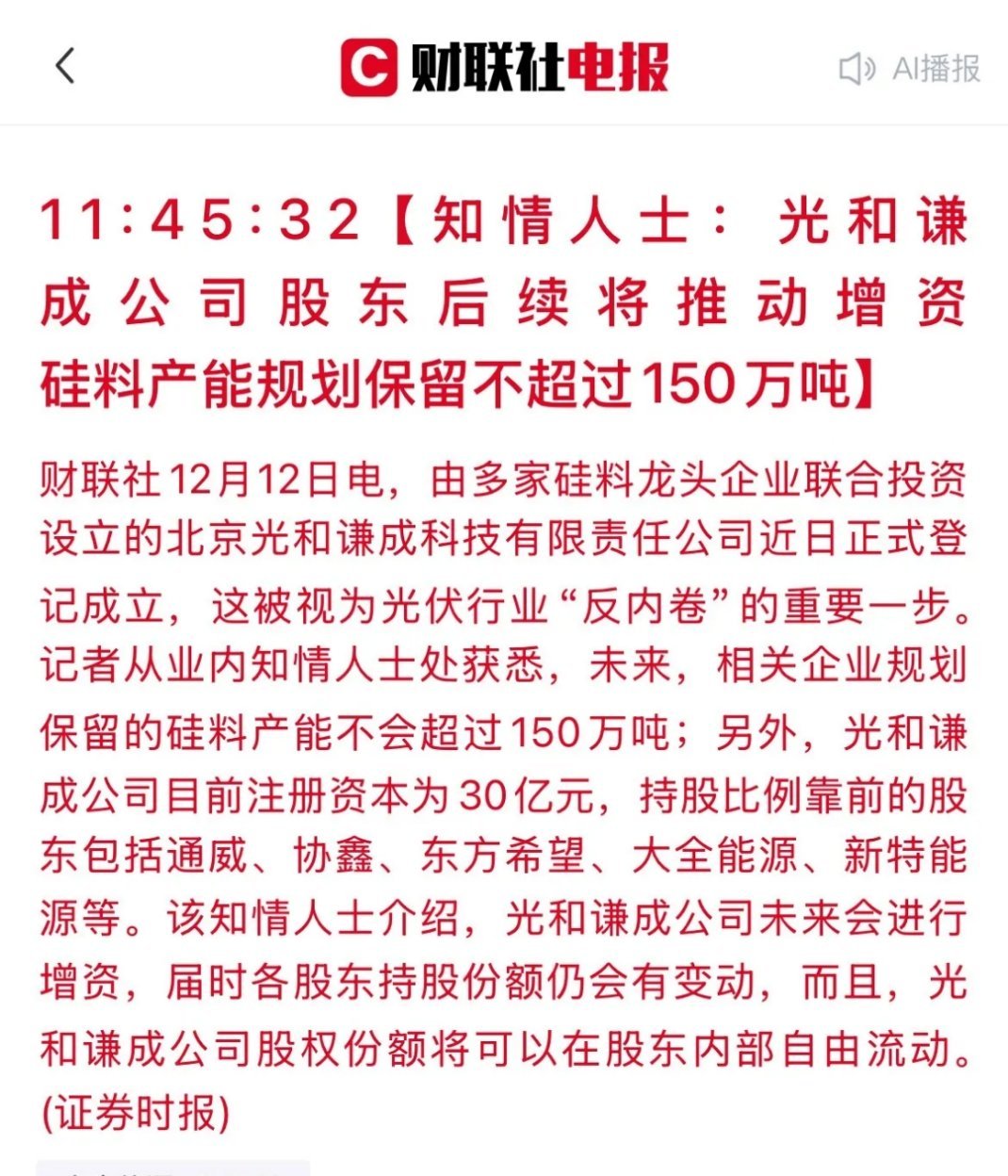 光伏行业打响“反内卷”第一枪!巨头结盟成立新平台,这些A股公司迎来发展新机遇硅料价格恶性竞争的局面或将画上句号!一则重磅消息搅动光伏行业格局——由通威、协鑫、大全等多家行业龙头联合出资的北京光和谦成科技有限责任公司正式成立,这标志着光伏行业“反内卷”从口头倡议迈入实质性落地阶段,核心目标直指整合行业产能、稳定市场供需秩序。这家新平台公司的股权架构颇具看点,不仅规划后续推进增资扩股,股东内部还可进行股权流转,同时明确划定行业硅料总产能红线,未来保留的硅料产能将不超过150万吨,以此从供给端遏制产能过剩风险。作为此次行业变革的核心参与者,平台公司的直接股东将率先分得红利:- 通威股份:以约30%的持股比例稳居第一大股东,在平台运营中扮演主导角色,话语权显著。- 大全能源:直接持股比例超11%,核心硅料供应商的行业地位将进一步巩固。- 南玻A:通过旗下子公司间接持股,将深度受益于行业供需关系改善带来的市场回暖。此外,协鑫科技(港股)、东方希望、新特能源(港股)等企业也位列重要股东名单,共同参与平台的战略决策。硅料价格企稳对光伏全产业链而言意义深远,尤其是下游一体化组件企业将迎来成本端的确定性利好。对于完成“硅片-电池-组件”垂直一体化布局的企业来说,上游成本可控后,盈利稳定性将大幅增强。相关受益个股包括:隆基绿能、晶澳科技、天合光能、阿特斯等。此次龙头结盟被视作光伏行业从价格混战转向良性竞争的关键转折点。若相关举措顺利落地,硅料价格有望逐步回归合理区间,不仅头部硅料企业的盈利水平将得到改善,下游一体化组件龙头也能更好地把控成本、释放利润空间,光伏全产业链都将迎来高质量发展的新契机。