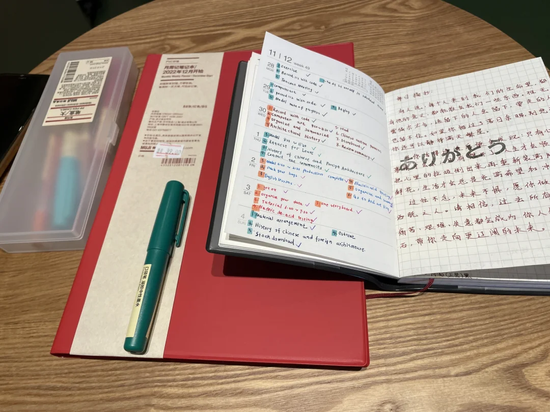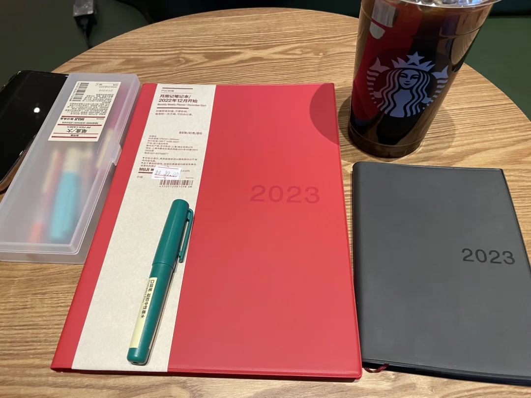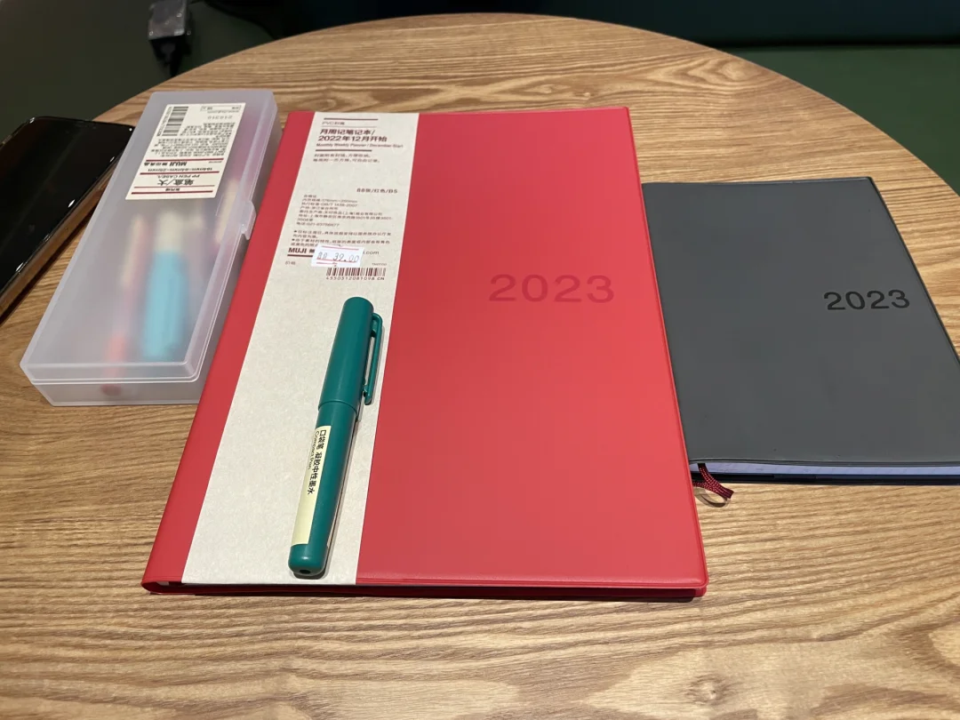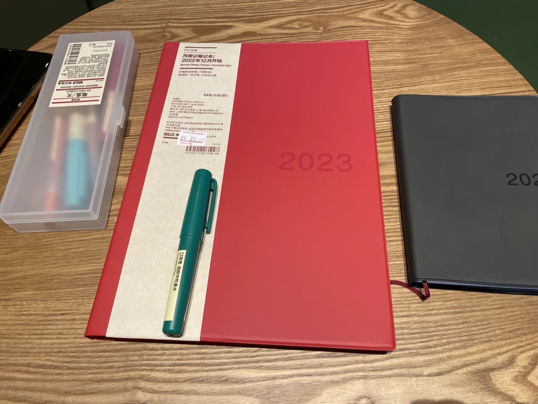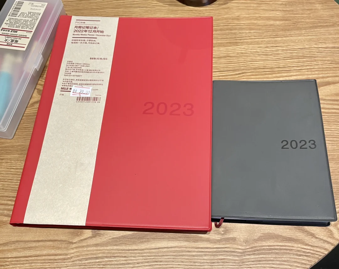 你好呀2023 笔记灵感MUJI muji日程本 好物分享 第一本A6(最小的)黑色的,花了48米,是21年9月份买的,12月份开始用。 第二本B6(最大的)红色的,原来没记错的话应该是98米,今天去muji,发现变成39米,如此心动就买了一本。 现在情况是不知道两本Muji如何一起使用?求大佬们给个建议?本人真的不会了……