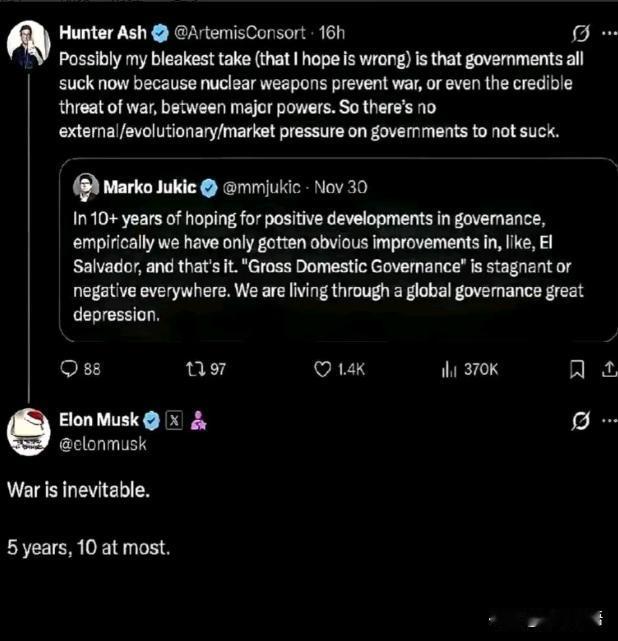 马斯克凌晨3点不睡觉, 直接给全世界泼了一盆凉水。 他在网上断言:战争无法避免,就在未来5到10年。 在马斯克的推演里,超级债务、人口崩塌和人工智能的野蛮生长,正搅合成一杯剧毒的鸡尾酒,一旦哪天世界扛不住压力了,第三次世界大战就会爆发! 这不是危言耸听!美国2025年11月刚公布的数字,光市面上流通的国债就破了30.2万亿美元,算上政府内部欠账更是冲到38.4万亿,这是什么概念?相当于每个美国人背着10万美元的债,一年就得掏1.2万亿美元的利息! 2025年美国财政赤字才1.78万亿,等于赚的钱一大半都用来还利息,花旗银行的分析师都直言这是陷在流沙里,越挣扎沉得越快。 过去国家没钱了还能靠抢殖民地、发战争财翻身,现在这套老路子没了,但债务压力可没减。 希腊债务危机时街头烧垃圾桶的场景还历历在目,那只是一个小国的困境,要是美国这种超级大国扛不住,大概率不会乖乖勒紧裤腰带,更可能通过挑起地区冲突转移矛盾,毕竟动荡的国际局势里,军火和能源才是硬通货,这可是历史反复验证过的套路。 债务这颗雷还没爆,人口崩塌又给浇了桶油。联合国刚发的报告说得明明白白,全球都在掉进低生育率的坑里,39%的人因为没钱不敢生孩子。 韩国创下世界纪录,2024年总和生育率跌到0.72,平均一个女人连一个孩子都生不到,街上的幼儿园闭园速度比奶茶店倒闭还快;日本也好不到哪去,2024年新生儿才68.6万,总和生育率1.15,连续9年刷新最低,自卫队招兵都快招不到了,只能靠无人机填补兵力缺口,计划2027年就部署310架自杀式无人机。 人口问题从来都和战争挂钩,年轻人少了,劳动力和兵源就紧张,经济增长没动力,各国为了抢劳动力、抢市场,矛盾必然升级。 想想看,一个老龄化严重的国家,看着邻居有充足的年轻人口,能不眼馋?这种资源争夺的背后,往往就是冲突的苗头,毕竟谁都不想眼睁睁看着自己的国家慢慢衰落。 最让人头皮发麻的是AI的野蛮生长,它把前两个危机的风险直接放大了十倍。 现在的AI早就不是只会聊天的小玩意儿,CNN去年还闹过笑话,把中国日报记者当成“AI人”污蔑,用移花接木的剪辑搞舆论战,这背后就是AI深度伪造技术的锅。 这种技术门槛越来越低,随便一段虚假视频就能煽动民众情绪,去年某国选举就因为深度伪造的丑闻差点引发骚乱,要是用来挑动国与国之间的矛盾,简直一挑一个准。 军事上更夸张,美国的“忠诚僚机”能自主配合有人战机作战,俄罗斯在战场上扔的自杀式无人机,不少都是AI控制的,日本花一万亿日元搞无人机部署,说白了就是想用AI弥补人口不足的短板。 AI让战争的门槛变得极低,不用再动员几十万大军,几个人操作一批无人机就能搞破坏,而且自主武器系统还可能出现误判,保不齐什么时候就伤人。更可怕的是,AI军备竞赛已经开始,各国都怕落后,拼命砸钱搞研发,这种“比烂”的节奏,只会让战争的风险越来越近。 这三者搅在一起,就成了无解的死循环:债务压力大,就要抢资源;人口不够,就要靠AI补;AI发展快,又让冲突更容易爆发。马斯克之所以敢这么说,就是看透了这套循环的毒性。 现在的世界就像一辆刹车失灵的车,债务是油门,人口问题是减重,AI则是把方向盘掰得越来越偏。 别觉得战争离我们远,当超级大国要靠卖军火还利息,当老龄化国家要靠AI武器自保,当虚假信息能轻松点燃民众怒火,那些看似遥远的冲突,可能就在下一个转角。毕竟在生存压力面前,理性往往是最先被抛弃的东西,这也是马斯克凌晨三点敲下那些字时,最让人不寒而栗的地方。