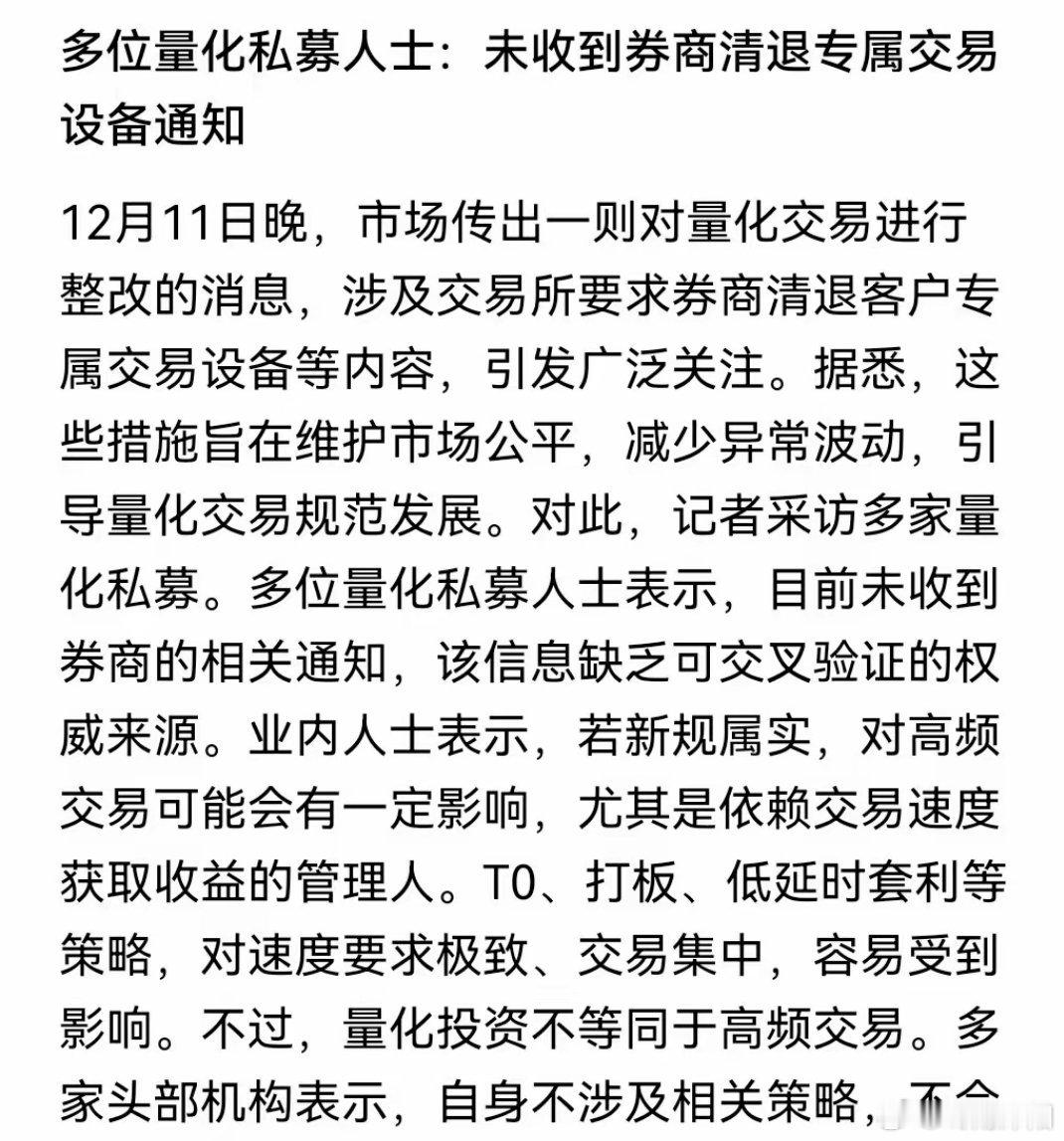 量化交易清退传闻搅动市场 微盘股尾盘跳水无需过度解读昨日,“量化交易清退”的传闻在市场中迅速发酵,受此消息影响,午后两点过后微盘股集体大幅跳水,市场普遍认为这是量化机构为规避风险、及时止盈离场引发的波动。不过在我看来,大众对此的担忧其实有些过了。量化交易非但不会被大规模清退,反而会朝着更普及、更壮大的方向发展。要知道,A股市场赫赫有名的游资标杆——拉萨军团,本质上就是量化资金的一种马甲形式,堪称量化交易的“鼻祖”级存在。再者,A股当前的成交量高度依赖量化资金的交易活跃度。如果没有量化资金的对倒交易作为支撑,A股单日成交量恐怕很难突破5000亿大关。即便今年以来拉萨军团这类游资量化资金大举入市,其可动用的资金规模也并非无限量供应。所以,与其对传闻过度恐慌,不如放平心态,学会接纳市场既有的游戏规则,以“既来之,则安之”的从容姿态应对市场波动。