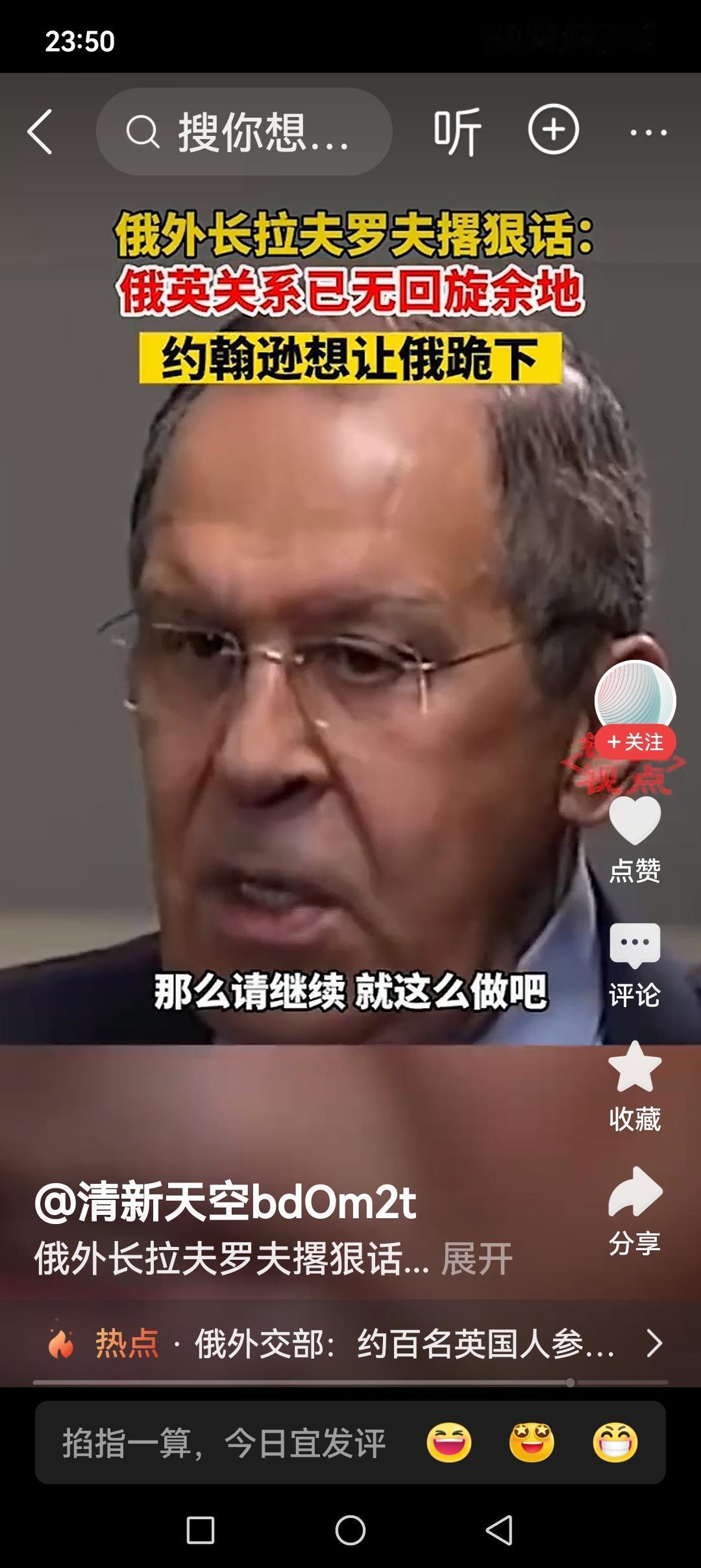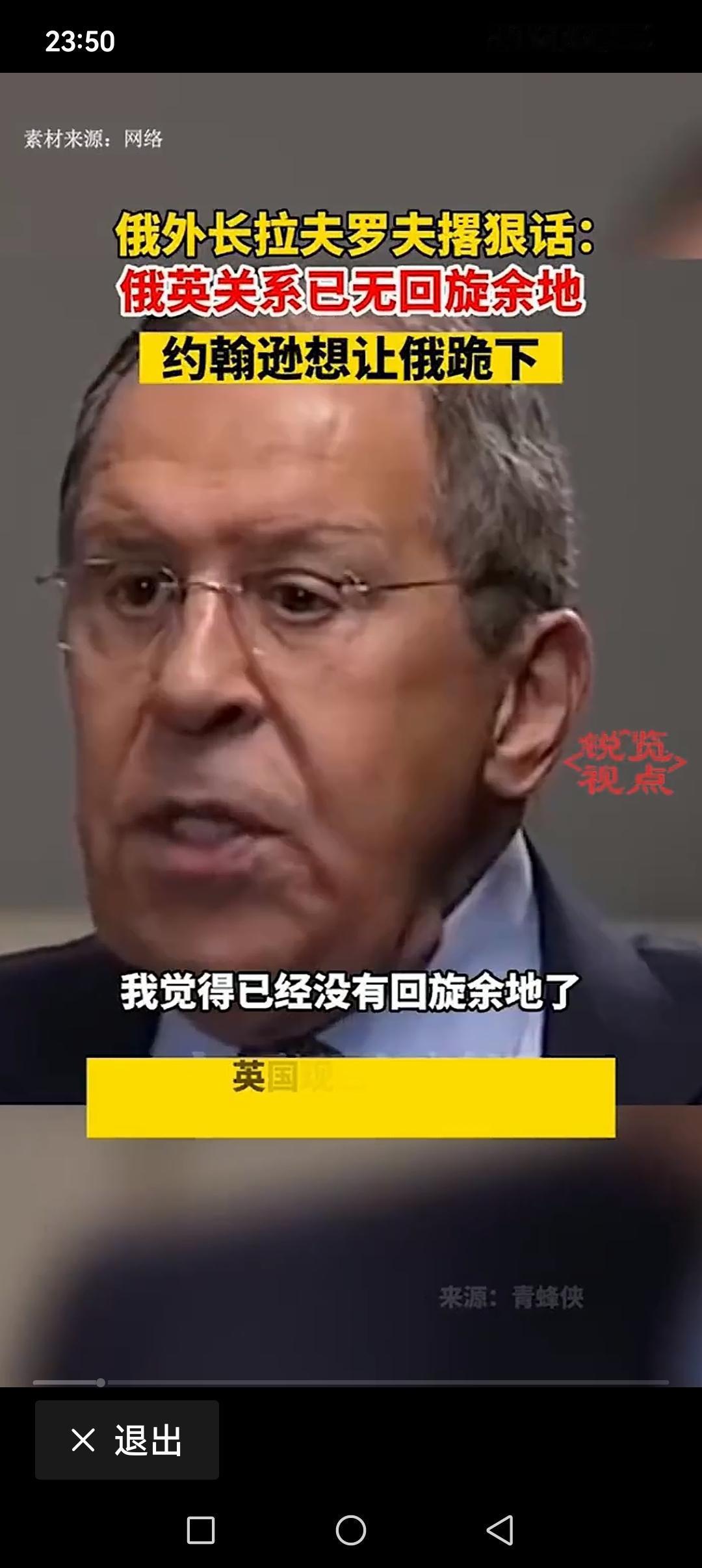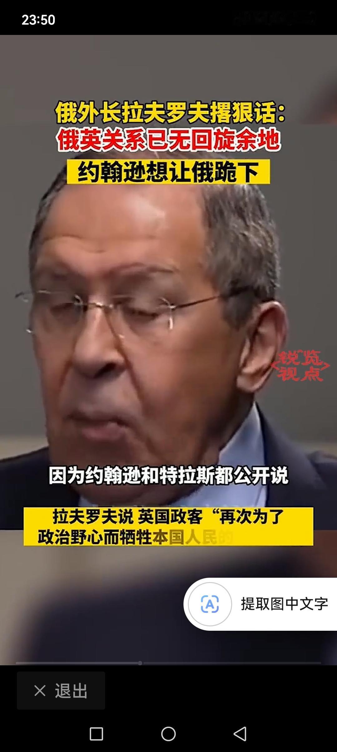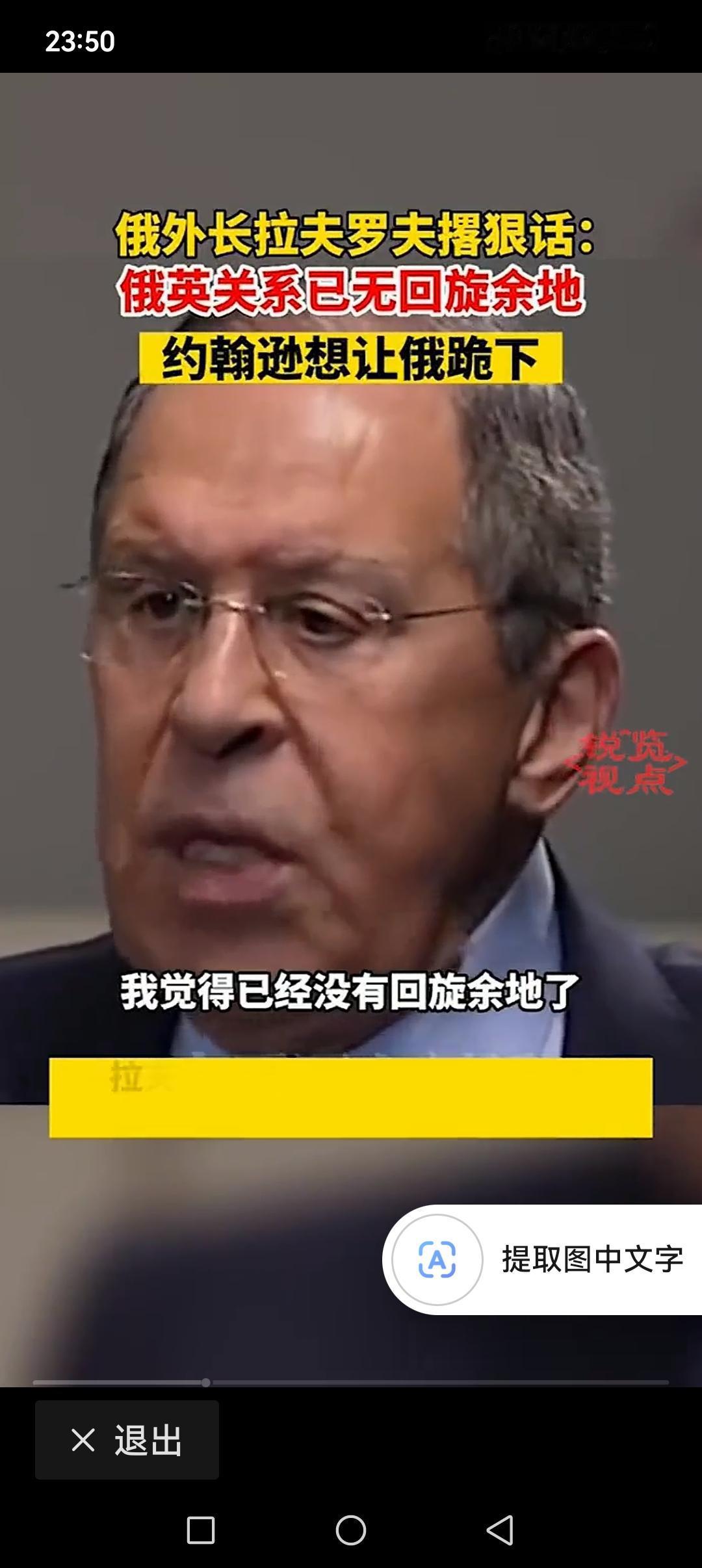 俄外长拉夫罗夫一脸严肃!俄英之间的矛盾已经不可调和!英国希望俄战败跪下… 英国方面高调宣布,一名英军在乌战场身亡。英国方面给出的解释是实验新装备出意外。其实不过是一厢情愿的说法。 另外拉夫罗夫说乌克兰战场已经有大约一百名英军特种兵协同乌军和俄军作战。双方心照不宣。 按照俄外长的说法,俄英关系紧张不可调和。俄罗斯方面说英国人希望战场打败俄罗斯,并且要俄跪下……