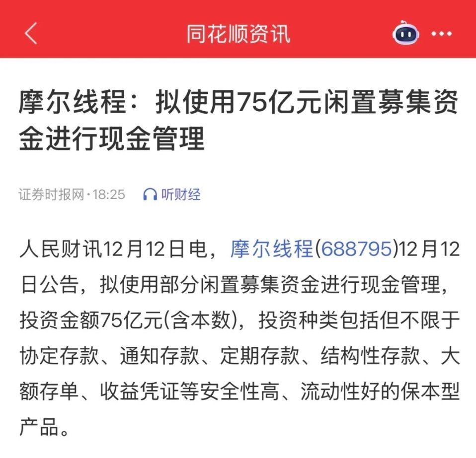 75亿募资躺平理财?摩尔线程的争议背后,是股民对科技突围的急盼摩尔线程拟用75亿元闲置募集资金进行现金管理的公告,彻底点燃了A股舆论场——上市募资净额75.76亿元,近乎全额拿来做理财,让满心支持科技创新的股民散户直呼不解:“我们真金白银投钱盼着搞研发,结果公司先躺着吃利息?”这场争议的核心,早已超出“闲置资金理财”本身。要知道,摩尔线程是闪电过会、一路开绿灯的科创板企业,顶着“国产GPU突围者”的光环,却至今仍处巨亏状态:2025年前三季度亏损7.24亿元,三年累计亏损超50亿元,2025年预计仍将亏损7-11亿元。更刺眼的是,公司营收规模不足10亿元,市值却一度炒到超4000亿,动态市销率接近300倍,远超行业均值。一边是高估值、高亏损的基本面,一边是上市即把募资拿去理财的操作,股民的质疑自然情理之中:“既然当下用不上这么多钱,为何要募集80亿元?”“拿着市场给的信任,不该优先砸向研发补短板吗?”从规则来看,上市公司用闲置募集资金做现金管理并非违规。证监会明确允许此类操作,核心要求是“安全性高、流动性好、不影响募投项目、不改变资金用途”,且不得投资非保本型产品 。摩尔线程也强调,此次理财仅投向协定存款、大额存单等保本型产品,12个月内可循环使用,不会影响70亿元芯片研发项目的推进,保荐人中信证券也出具了无异议核查意见。客观来说,科技研发本就不是“资金一投就见效”的短跑,大额募资分阶段投入是行业常态,闲置期间合理理财提升资金效率,也符合股东利益。但股民的不满,本质是“爱之深责之切”的期待落差。大家之所以愿意为300倍市销率买单,愿意支持其高溢价上市,是盼着国产GPU能突破技术封锁——毕竟摩尔线程的12nm制程仍落后国际巨头2-3代,AI计算效率仅为英伟达的1/3-1/10,MUSA架构生态开发者数量也远不及CUDA生态。在“卡脖子”困境待解的当下,公众期待的是企业把每一分钱都用在刀刃上,加速缩小技术差距,而非让巨额募资闲置生息。这场舆论风暴大概率会持续发酵,支持方认为“合理盘活资金无可厚非”,反对方则吐槽“拿着融资款躺赚利息,缺乏创新紧迫感”。但争议的背后,恰恰是市场对国产科技企业的高标准、严要求。对摩尔线程而言,平息质疑的最好方式,或许不是辩解理财的合规性,而是用实打实的研发进展、产品突破,证明自己配得上市场的估值与信任。毕竟,科技突围从没有捷径,唯有真金白银的投入与持之以恒的攻坚,才能不负资本市场的期待。