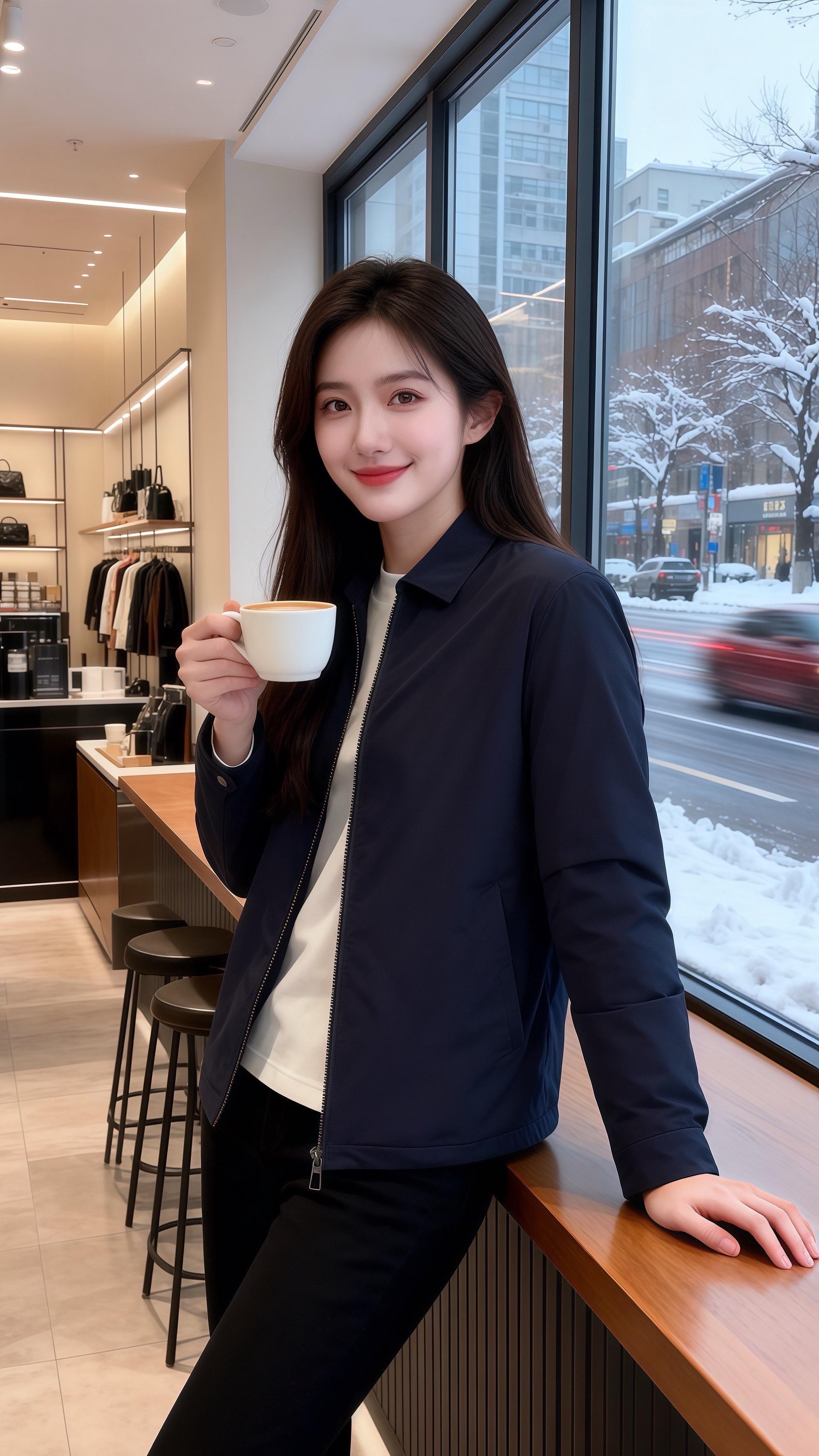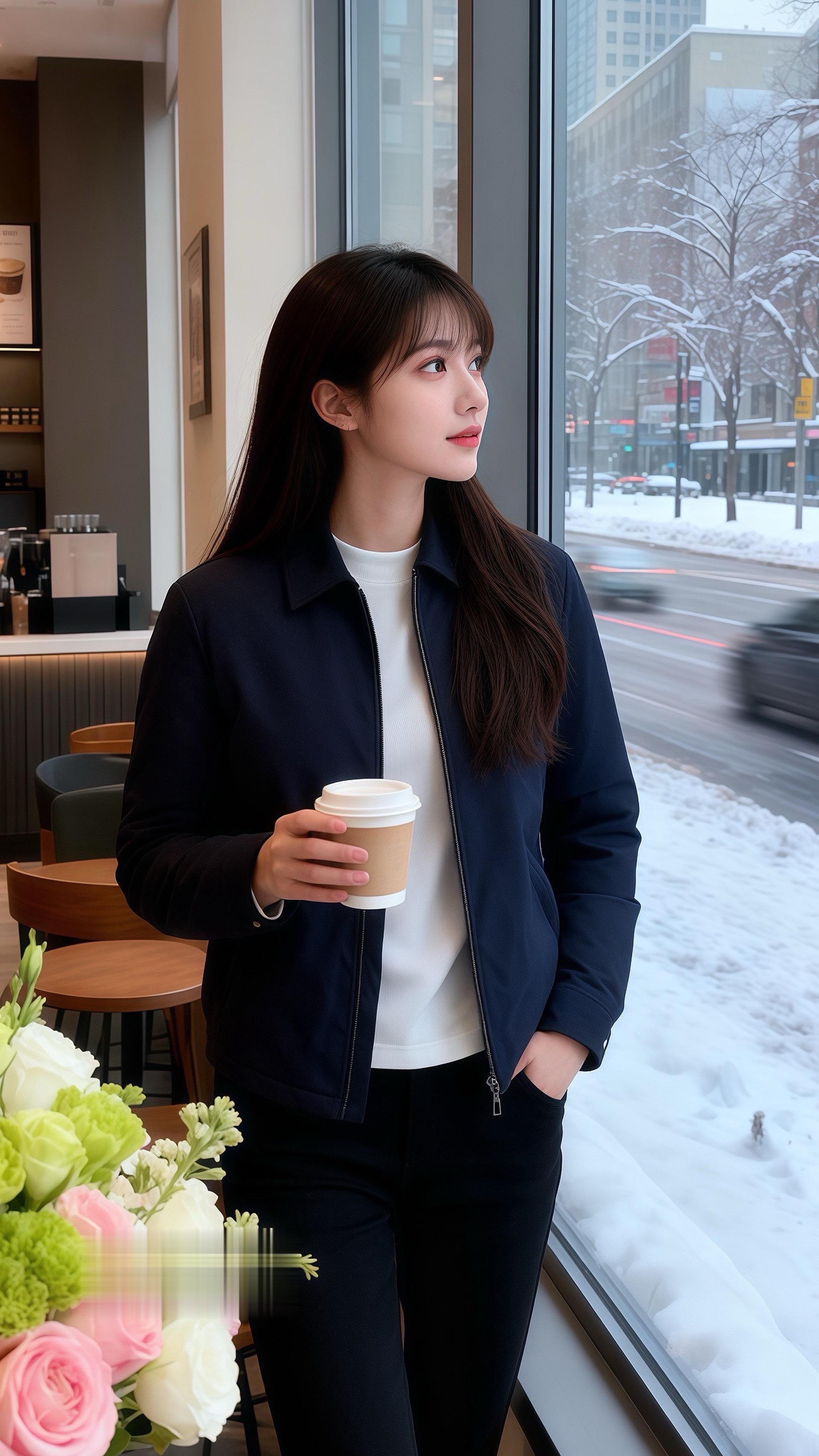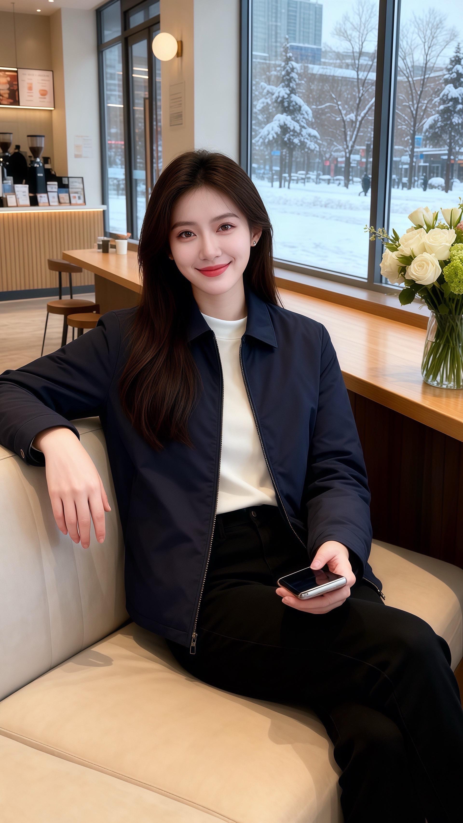 她穿藏青色翻领短外套,面料带着顺滑的哑光质感,拉链半开露出内搭的米白半高领衫,冷调的藏青与柔和的白相撞,衬得肤色愈发温润。下装是黑色长裤,裤型宽松却不失版型,和外套的简约风格呼应,整身穿搭像冬日里的深海,沉稳的藏青裹着细腻的温柔,连桌旁的花束都成了灵动的点缀。