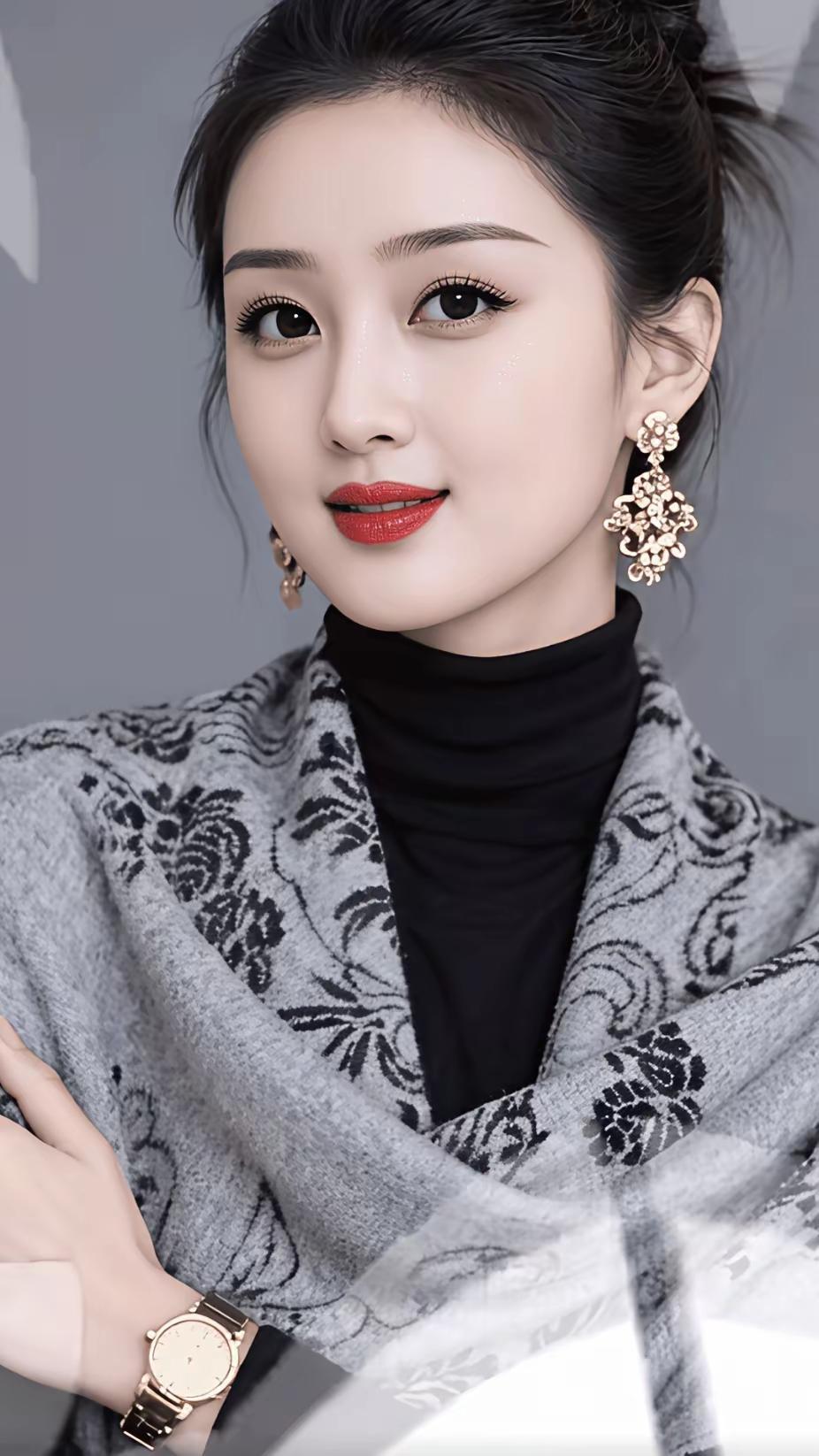 绝色冷艳美女肤白貌美长睫浓妆,红唇浅笑妩媚贵气。微卷浓发配灰橘色衬衣、白裤,咖巾