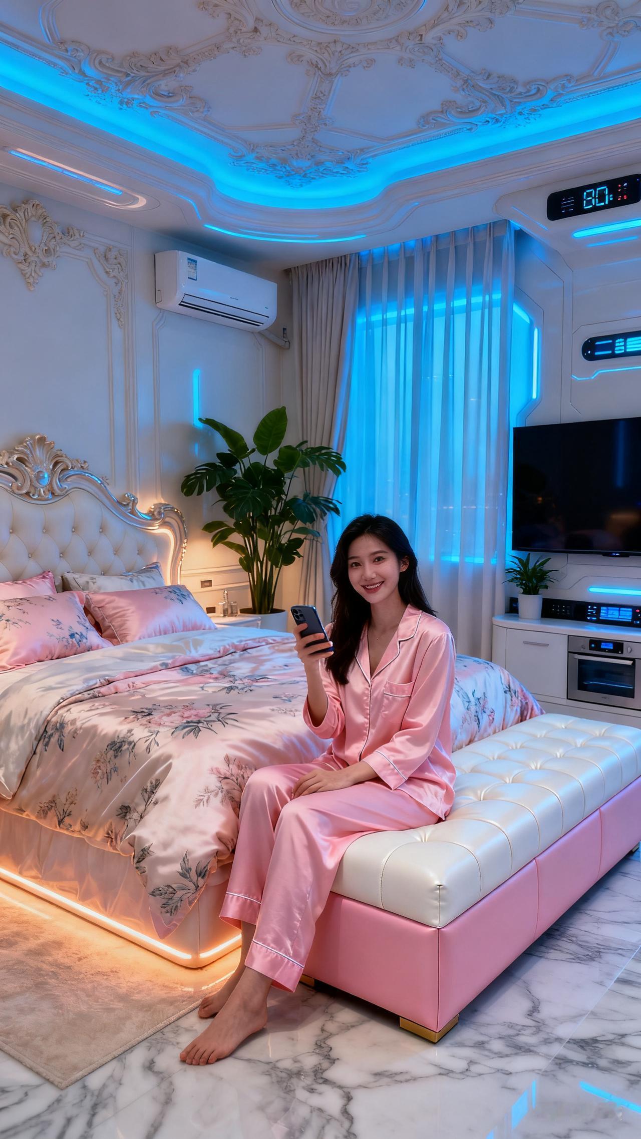 女子着粉睡衣坐床边持机微笑,绿植点缀,智能窗帘半掩,暖蓝光映大理石地,反差吊顶衬暖调神秘氛围。