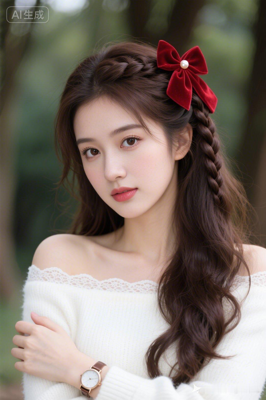 年轻美女肤白貌美,深棕披肩长卷发顶侧编小麻花,两侧碎发垂落,红色丝绒珍珠蝴蝶结点缀,精致眼线与纤长睫毛清晰可见,气质灵动。