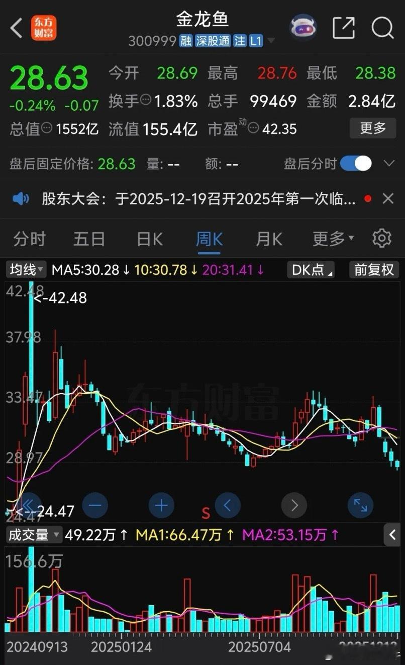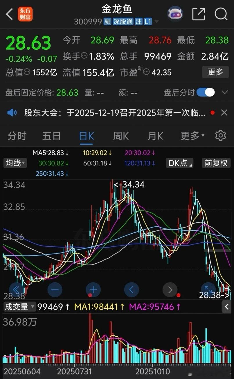 金龙鱼开盘后惨烈跳水再创新低,看K线图真的被吓到了,最近一个月持续下跌,周线连续暴跌4周,前一个多月持续反弹,再加上市场天天两万亿火爆行情,同时三季报业绩大幅增长,以为已经走稳,但是最近一个月断崖式下跌真的让人难以理解,不仅再次跌破30关口还创下去年牛市以来新低,金龙鱼作为一个知名公司既不是亏损股又不是垃圾股怎么可以在牛市中跌成这样子,惨不忍睹,A股现在神奇的是偏偏暴涨的股票是亏损股。