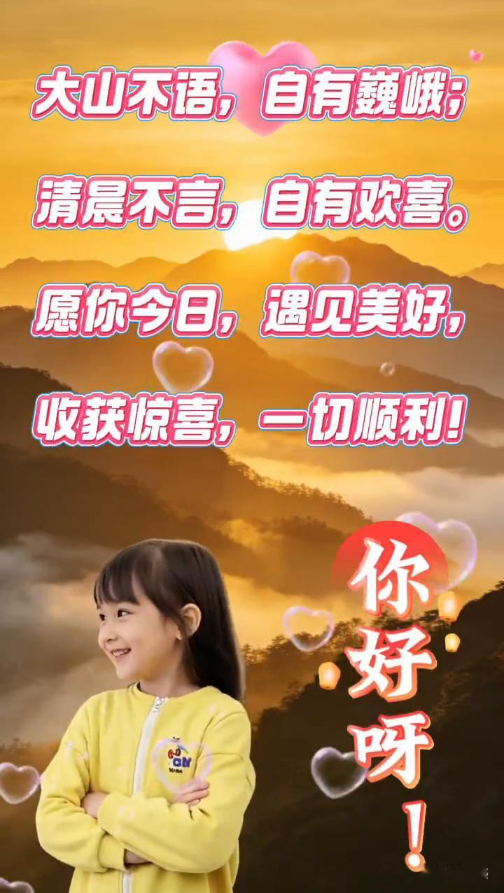 大山不语,自有巍峨;清晨不言,自有欢喜。愿你今日,遇见美好,收获惊喜,一切顺利!你好呀!