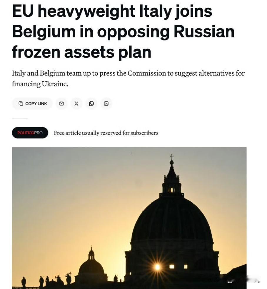 意大利与比利时一同反对欧盟的俄罗斯资产冻结计划。 比利时反对冻结俄罗斯资产计划是因为大部分被冻结的俄罗斯资产是存放在比利时境内的 Euroclear 清算系统,因此,一旦发生法律争端或赔偿责任,承担风险的主要会是比利时本身。 ----------------------- 意大利的反对理由似乎没有比利时的那么充分。
