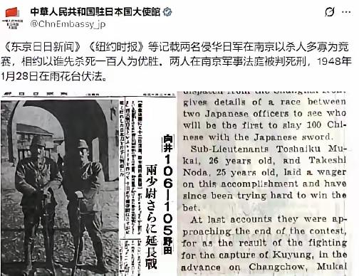 那天我翻出一张特别旧的报纸,就是这张《东京日日新闻》,都黄得快看不清字了,报纸边角都卷了边,墨迹都有点晕开了。可当我看到上面的内容,气得手都抖了:两个日本军官,手里的军刀都卷了刃,刀背上还沾着血,身后就是一堆堆同胞的遗体,看着就让人心里发堵,标题更是明明白白印着“百人斩竞赛”! 这哪是什么珍贵的史料啊,这就是1937年日本自己家报纸登的报道,你说讽刺不讽刺?就连当年的《纽约时报》,都把这场暴行写得清清楚楚,一点没含糊。铁证摆在这儿,1948年这两个恶魔不就被国际法庭判了死刑?可现在呢?还有人敢跳出来说这是假的,是伪造的历史? 我又找了日本国立国会图书馆的电子档案,那些发黄的报纸扫描件上,日文报道清清楚楚写着“两少尉斩杀百人竞赛”。他们还嘴硬说“只是击毙武装人员”,可你看照片里倒下的人,明明都是绑着双手的老百姓啊! 86年过去了,南京城墙上的弹孔好像还在渗血,幸存者李秀英老人临终前还在说:“我身上37处刀伤就是活证据”。历史可不会因为谁嘴硬就不见,就像那些埋在樱花树下的墓碑,不说话,却让每个中国人心里都沉甸甸的——你说,这样的历史,我们能忘吗? -search.byteimg.com/img/labis/09b3d2726475f4a0fd3ce1506bb9783d~480x480.jpeg