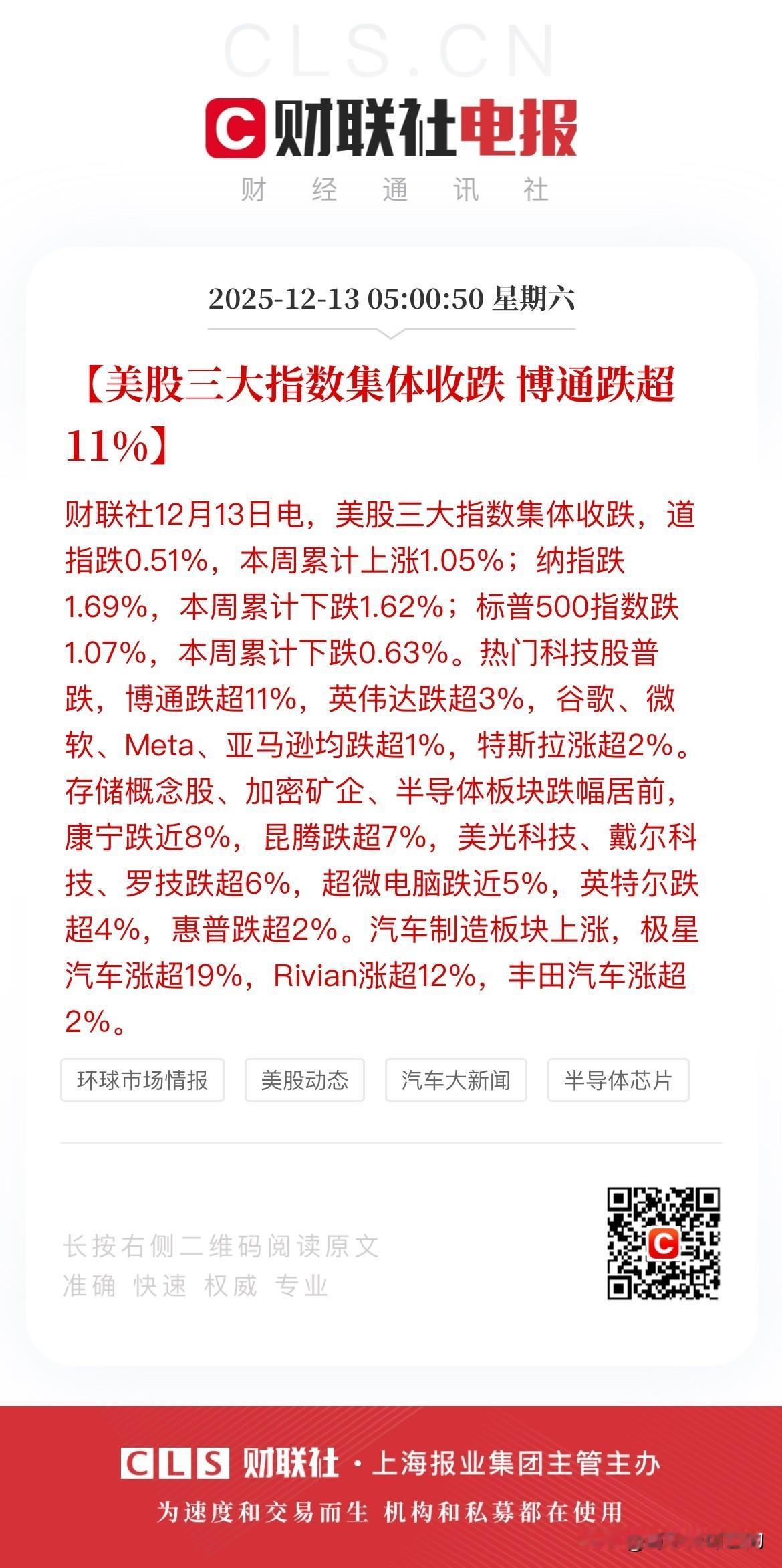 昨夜美股暴跌,美股前天杀甲骨文,昨夜又杀博通!下周一估计大A又悬了! 昨夜道指一度高开高走,盘中再度创下新高!可惜随着纳指的持续下挫,道指最终也跳水翻绿。截至收盘,道指跌0.51%,纳指跌1.69%,标普跌1.07%! 至于个股尤其是科技股更是惨淡,而这其中半导体更是重灾区! 博通业绩超预期,但是盘前就跌了6个多点,开盘则是直接低开6.32%,盘中一路走低,毫无反抗之力,最终收跌11.43%!莫非老美也玩起了大A业绩兑现那一套? 甲骨文则是在前一天暴跌10.73%的基础上再跌4.47%,创下半年新低!其余的,如 英伟达,跌3.27% 谷歌,跌1.01% 闪迪,暴跌14.66% 美光,跌6.7% 台积电,跌4.2% 超威半导体,跌4.81% 特斯拉昨晚倒是非常坚挺,反倒涨了2.7%! 我就发现美股这个科技股有点不对劲,感觉此前盛传的AI泡沫的担忧应该还在!但是国内的CPO、OCS近段时间反倒是高歌猛进,这倒是有些反常。 而受美股下跌影响,本来涨的好好的欧洲三傻也纷纷跳水翻绿。而以大A向来是跟跌不跟涨的毛病来看,下周一怕是要悬了[捂脸]!