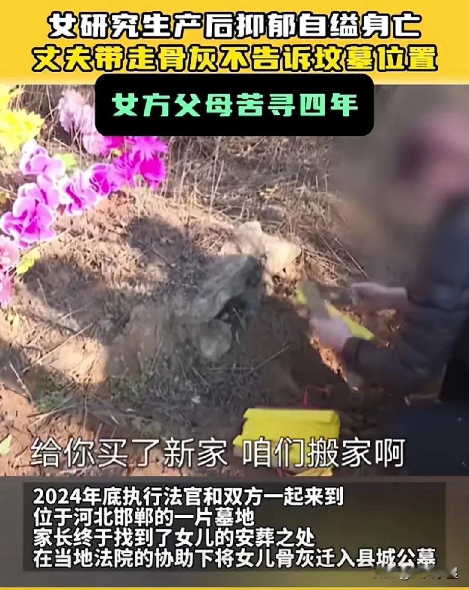 “妈妈给你买了新家,听到妈妈在叫你了吗?” 找到女儿埋葬之地后,黄阿姨已经哭成了泪人。自从得知女儿离世的不幸消息后,尽管她非常伤心,难以接受这个事实,但她依然想去找女婿问个明白,同时去女儿的坟墓祭拜一下。 女婿告诉她,她女儿是因为抑郁自杀的,至于埋葬到了哪个地方,他始终不肯透露半字,他心里觉得横s之人不能立碑。 黄阿姨及其家人怀着万分悲痛之情,苦苦寻找了4年,期间她到女婿老家寻找了几十次,但因为没有明显标志,始终都没有找到女儿的墓。 最后,她迫不得已申请了法院执行,女婿无奈只能告诉了她具体位置,找到后她们把女儿墓地迁到了县里的公墓。她觉得女儿喜欢美丽的风景,生前没有看到,死后要让她住在一个风景秀丽的地方! 可怜天下父母心,到最后发现最疼爱你的还是你的父母!所以,请善待自己的父母!