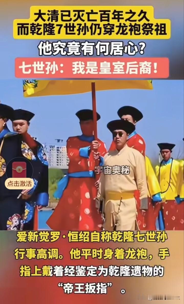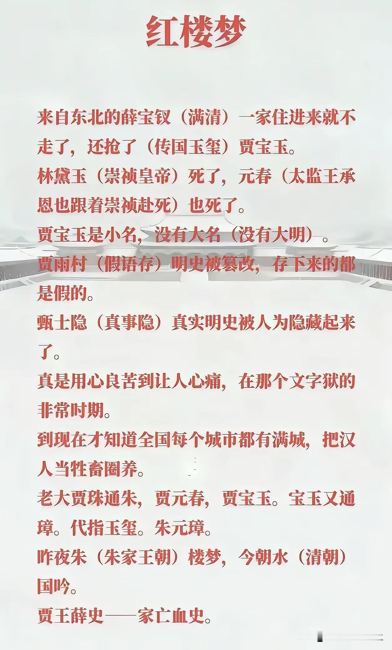 《红楼梦》解密后,最尴尬的是爱新觉罗后裔,以前说故宫是自家祖产,要国家归还,还穿龙袍祭祖,现在得夹着尾巴做人了。 《红楼梦》在300年后如一封家书般告诉了世人真相,它哪里是儿女情长的风花雪月,分明是大明王朝国破家亡的血泪悲歌。作者将故国山河,汉人民风民俗,刀光剑影事件以隐喻的方式藏于家庭的兴盛,鸡毛蒜皮的家事之中,怕满清看得懂,又怕后世汉人看不懂。红楼就是故宫,贾王薛史(家亡血史)从盛到衰就是明朝被清灭的史程。原来故宫是朱棣皇帝建的。 没有清朝什么事,清是强盗,鸠占鹊巢,华夏还差点断送在他身中,那些爱新觉罗后裔还沉浸在愚腐的优越感中。 据说是多尔衮的第十世孙爱新觉罗州迪,自称是大清唯一正统血脉,愿比对DNA,还说为了保证皇室血统的纯正,他拒娶平庸的异姓女子,还大言不惭地说,故宫是自家祖产,让国家归还。 清朝已灭一百多年,那些个以前隐姓埋名的满清后裔不仅回归姓氏,更是大肆炫耀。如乾隆七世孙恒绍,平时行事高调,经常组织族人按皇家规格办祭祀,手指还带着经鉴定为乾隆遗物的“帝王板指”,居心何在? 他们平时穿明亮的黄马掛,家里装修按皇宫格式以黄色为格调主,金碧辉煌。大家说,他们这不仅仅是贼心不死,背后说不定还有问题。 大明的江山到清手中,就是不停地割地,赔银,拿女人和亲,踩压汉人,没有一点拿得出手的功绩,弦耀个啥? 满清统治者销毁明朝档案一千多万件,焚毁中华典籍三千多种,十五万一千多部,中华文明惨遭劫浩,文化话语权自此丢失,曾经的“世界灯塔”在满清手中没落。 所以说,《红楼梦》深度解析后,断层几百年的汉史让世人所知,大明是华夏的脊梁,清就是华夏的败家子,没啥可宣传的,华夏儿女要挺起自信的脊梁,56个民族团结起来,重塑华夏巅峰。