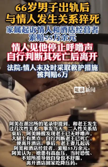 广西一则令人唏嘘的新闻悄然引爆网络:一名66岁男子在酒店与情人相约,二人亲密后男子却猝然离世,情人先是慌忙离开,随后又带人回酒店确认,事件背后到底隐藏着怎样的真相? 事情发生后,男子家属将情人告上法庭,索赔55万元,是出于何种心情发起这场官司?是对逝者的悲痛,还是对“遗弃”行为的愤怒?而情人却坚称当时自己并未完全清醒,只是回家吃降压药,完全不知道男子的状况。真相到底是她的疏忽大意,还是无奈的巧合? 这起事件击中了我们所有人的敏感神经:人到晚年,情感与健康的交织,本就复杂难解;凶险的突发状况,如何处理才是人道与责任的体现?离世是一种无可挽回的悲剧,可生者的选择却成为争议的焦点。我们不禁要问,在这样的时刻,如何做到既尊重逝者,也顾及人性和现实? 更深层次地,这揭示了现代社会中,晚年情感的禁区与盲点。传统观念让老人情事成为“隐秘”,法律与伦理又如何去平衡当事人的权利和义务?面对类似事件,我们是否都应有更多的理解与宽容? 网友们,你怎么看待这场纠纷?情人与逝者的关系是否该承担责任?家属的索赔合理吗?在这段充满争议的故事里,我们看到的是人性的复杂,还是社会的冷漠?欢迎大家留言吐槽,和我一起探讨这份沉重背后的社会话题。 分享你的新春祝福