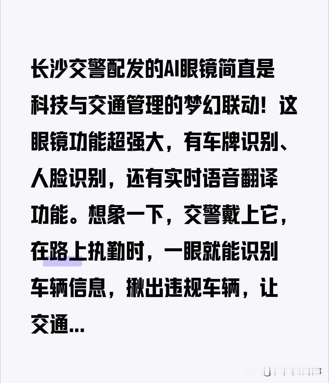 惊叹!长沙交警配备的AI眼镜,是科技与交通管理的绝妙融合。它功能强大,有车牌识别、人脸识别和实时语音翻译。交警执勤戴上它,一眼掌握车辆信息,揪出违规车辆,提高管理效率。人脸识别助力打击犯罪,让违法者无所遁形。 科技便利真切可感。AI眼镜上岗,提升交警效率,保障出行安全。长沙交警紧跟潮流提升管理水平,领先一步。