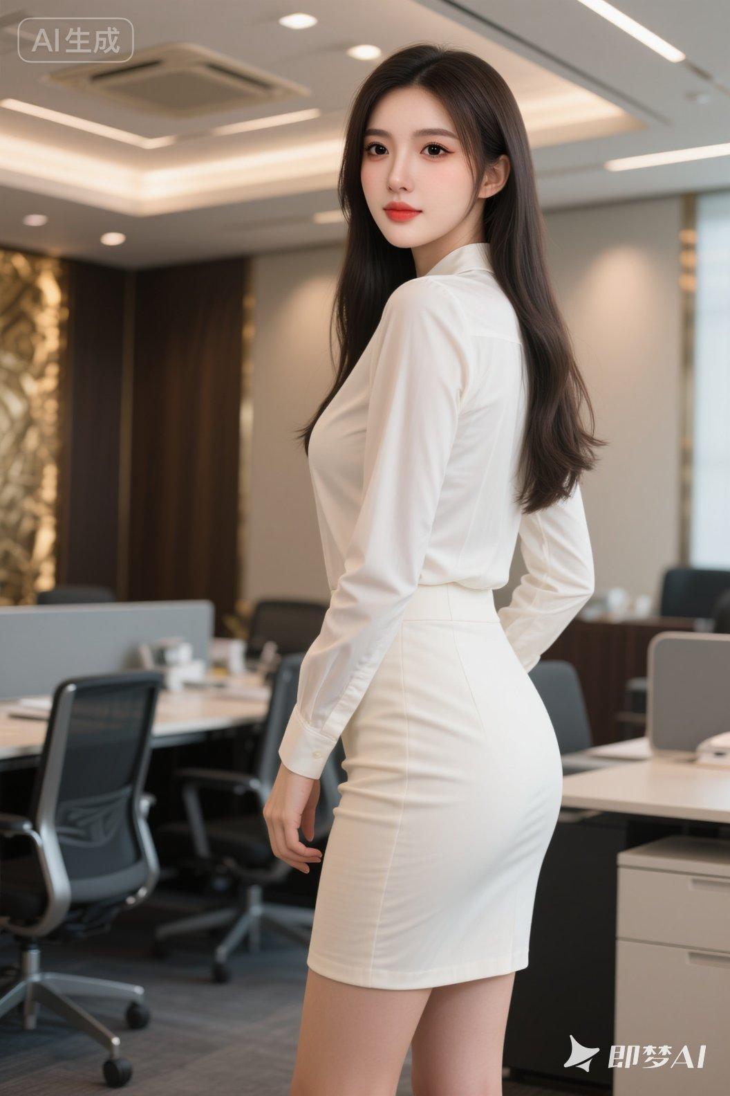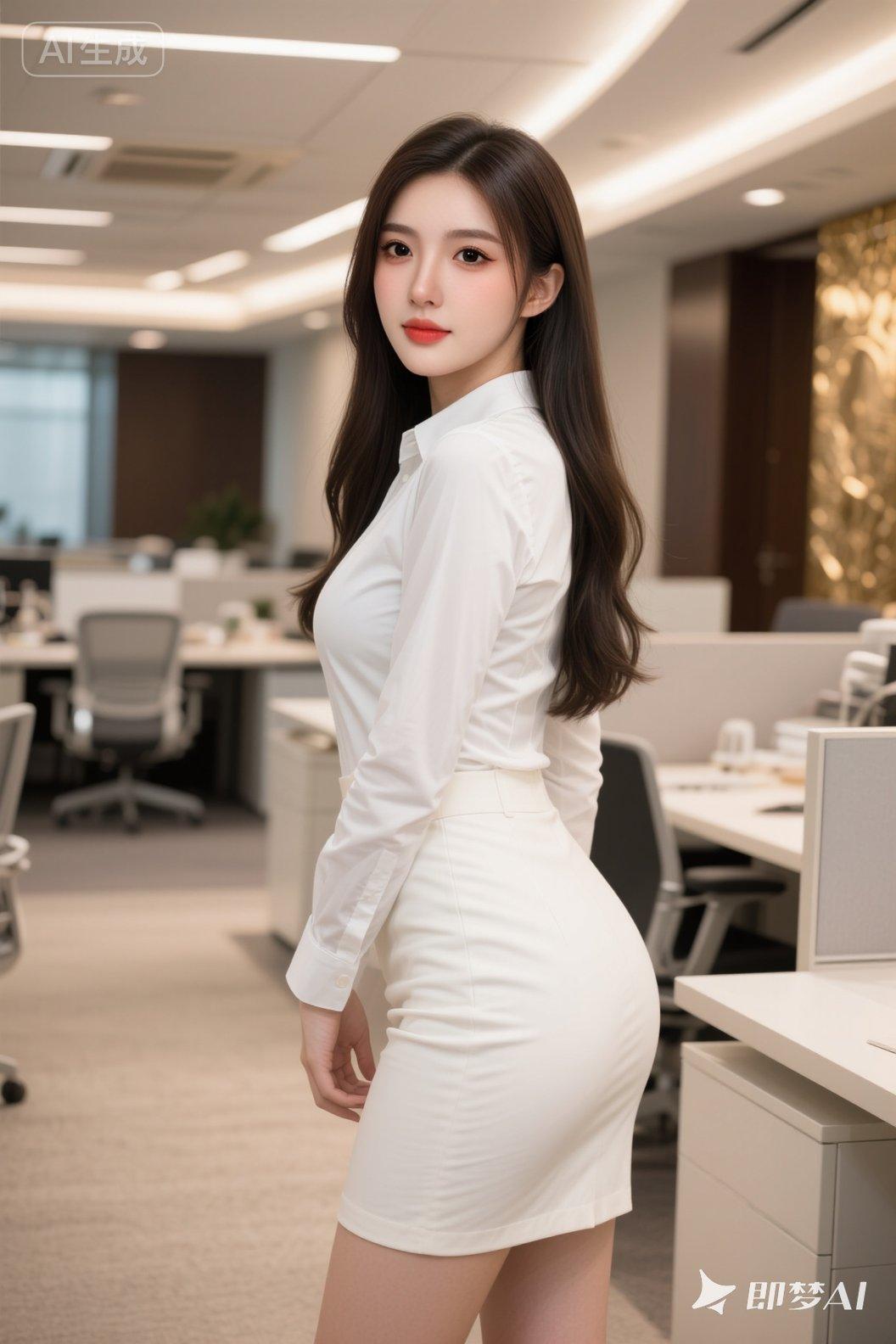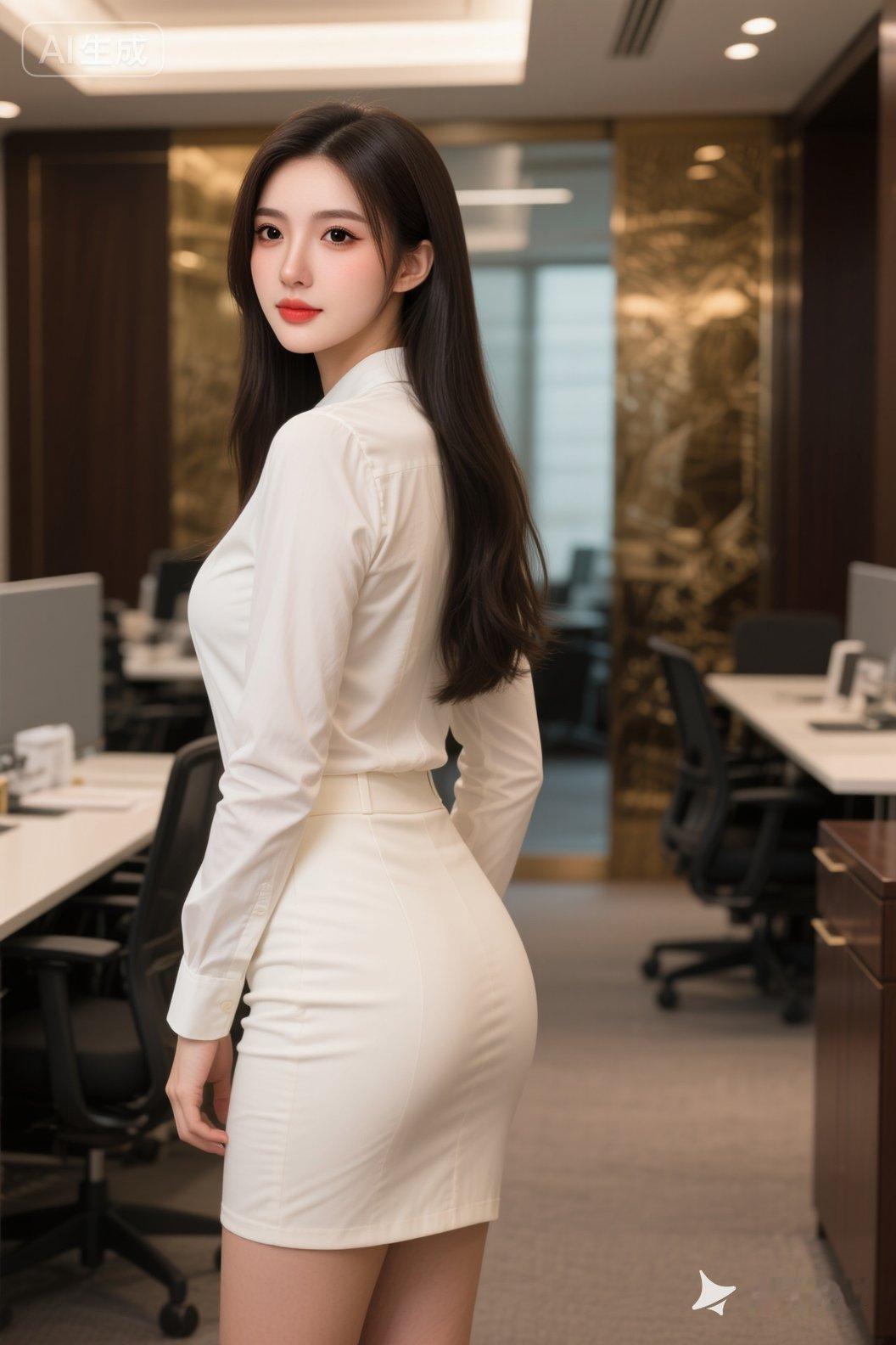 办公室女文员,25岁,穿着米白色贴身长袖衬衫,米白色包臀短裙,长发披肩,长相甜美,身材傲人,裤子整贴臀部