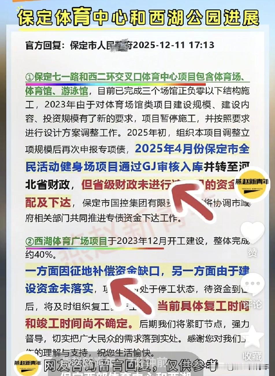 保定西部体育中心和西湖公园现在进展情况怎么样了?停工好久了,到底原因什么呢?新答复来了,果如所料资金问题…体育中心没给拨款,西湖公园没有资金…也是遥遥无期,奥运冠军之城,建一个体育中心真难…