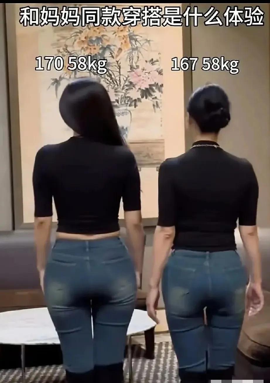 这两个女人是母女关系,大家从正面能分出谁是母亲谁是女儿吗?如果实在不行,有经验的男人看背面应该就很好分辨了。 现在生活条件好了,女人也非常注重保养,很多人生了孩子还像20来岁的女孩一样漂亮,所以导致很多母女走上街头真的很难分辨谁大谁小!从正面看,两个人脸型都差不多,身材很苗条都不显臃肿,就连体重和穿着打扮都是一样的,唯一不同的就是一个人高一些一个人矮一点。 看背影好像能看出一些端倪,生过孩子的女人胯是比较大的,腰腹部的脂肪也会多一些,所以我认为左边这个是妈妈,右边这个是女儿,你们觉得呢?有一点让我疑惑不解的是因为后天营养好一般来说女儿比妈妈要高一些,可是如果按照上面这样判断好像就反过来了,又有点不合常理,除非嫁的老公特别矮小。我相信我们网友一定有很多见多识广的,甚至还有些人对这方面有一定的研究,有高见的在评论区不吝赐教!!