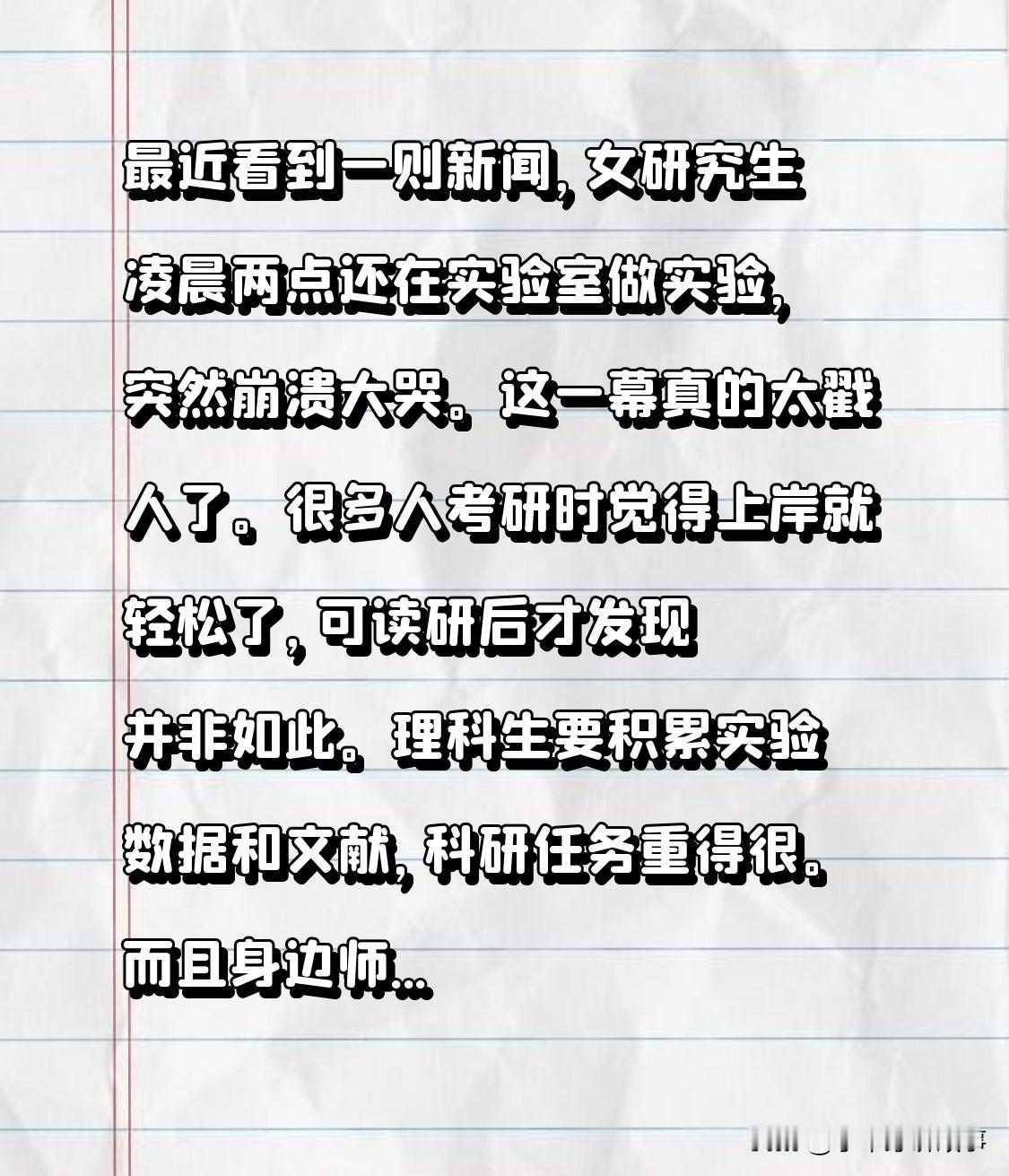 最近看到一则新闻,女研究生凌晨两点还在实验室做实验,突然崩溃大哭,这一幕太戳人了。很多人考研时以为上岸就轻松,读研后才知并非如此。 理科生要积累实验数据与文献,科研任务繁重。身边师兄、老师水平高,更显自己不足。再看没考研的同龄人,已工作、结婚,自己却在实验室熬夜。如报道女生,好友结婚,自己单身,能不难受?读研身心俱疲。 研究生精神状态