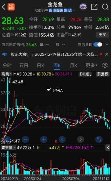 个股走势分析:在 A 股市场两万亿成交额的火爆行情下,$金龙鱼 sz300999$ 股价呈现显著背离走势。作为业绩稳健的行业龙头,公司 2025 年三季报实现营收 1842.7 亿元、归母净利润 27.49 亿元,同比分别增长 5.02% 和 92.06%,且前一阶段已呈现持续反弹态势,市场曾普遍预期其走势企稳。但近一个月内,该股股价上演断崖式下跌,周线连续 4 周收跌,不仅跌破 30 元关键关口,更创下去年牛市以来的阶段新低,与同期市场整体热度形成强烈反差。股价异动核心驱动因素突发利空引发业绩担忧:子公司广州益海卷入合同诈骗案,一审被判连带赔偿 18.81 亿元,该金额相当于公司 2024 年全年净利润的 75%,虽公司已提起上诉,但巨额赔付风险显著侵蚀市场信心。指数剔除加剧资金流出:受上述利空影响,MSCI 已将金龙鱼从中国指数中剔除,被动资金的减持进一步放大了股价调整压力。市场风格与资金偏好切换:当前 A 股资金更倾向于追逐具备政策催化或赛道红利的题材标的,传统消费类绩优股缺乏增长故事,难以获得资金持续青睐。市场分化的底层逻辑当前 A 股市场呈现明显的估值撕裂格局,亏损股暴涨与绩优股回调形成鲜明对比。这类现象的核心逻辑在于,股价定价的核心已从 “当下业绩” 转向 “未来预期”:亏损标的多凭借 AI、半导体等热门赛道属性,或国产替代等政策红利,成为游资与短期资金炒作的对象;而金龙鱼这类传统行业龙头,尽管盈利稳定,但增长天花板相对明确,在短期博弈主导的市场环境中,难以形成估值溢价。