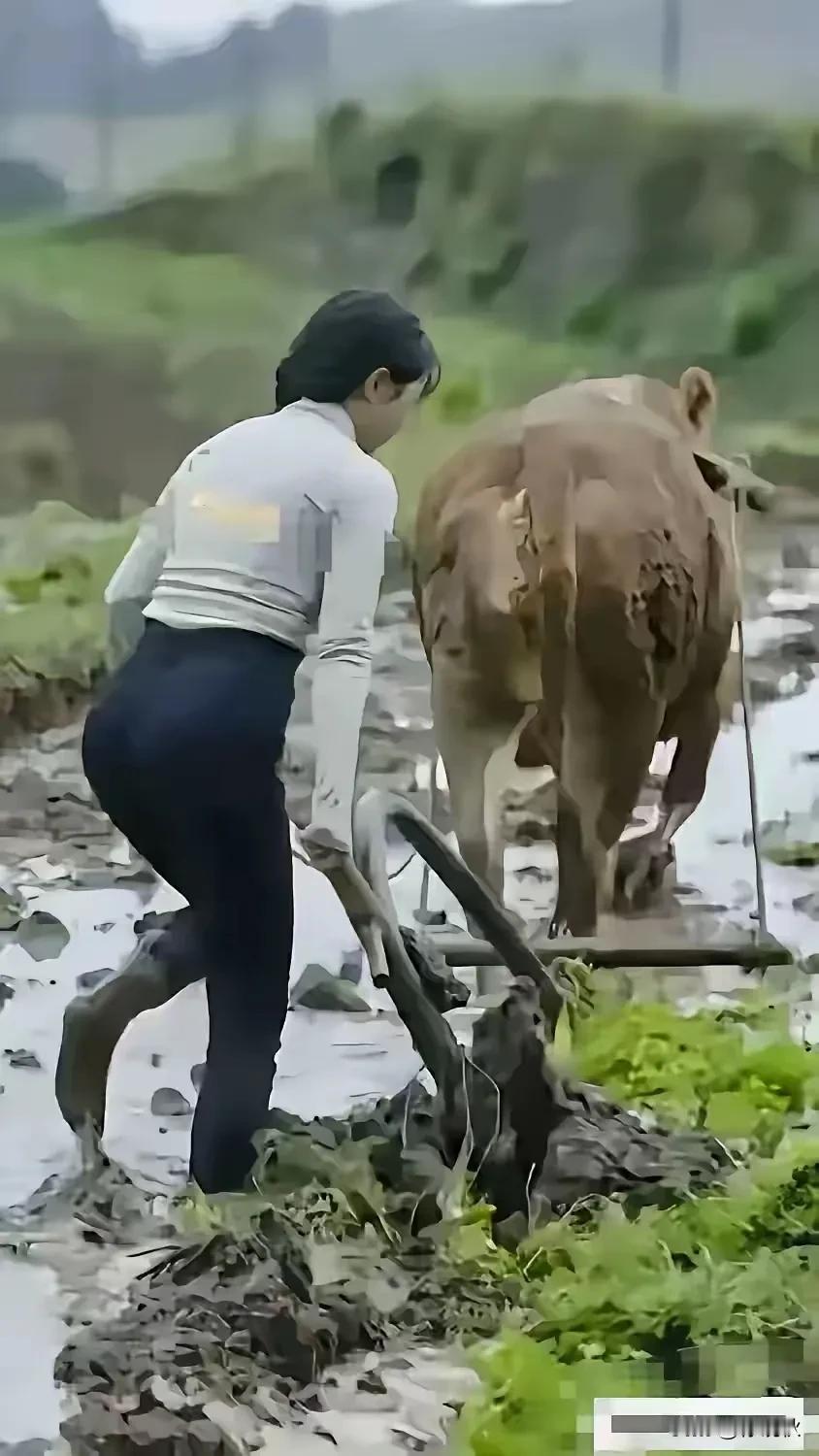 女人扶犁牛前移, 水田劳作半身泥。 吃苦耐劳不稀奇, 家无男人苦命你。