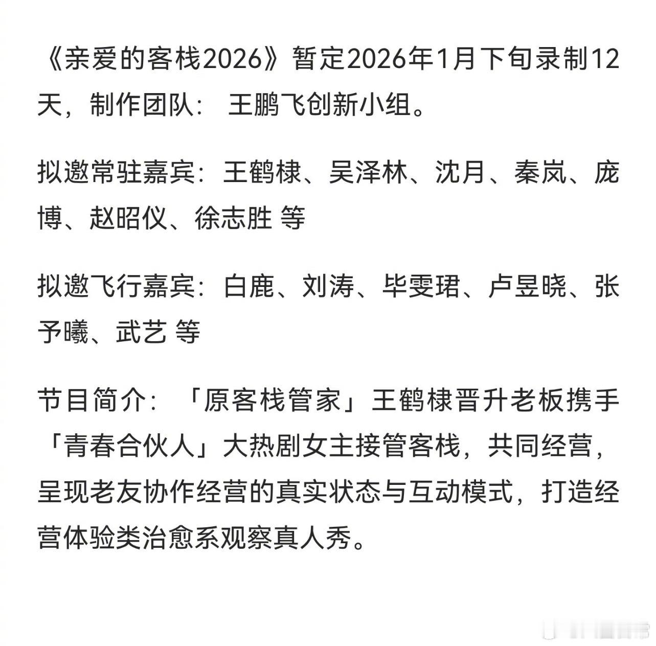 🍉《亲爱的客栈2026》王鹤棣、沈月常驻亲爱的客栈 棣月常驻