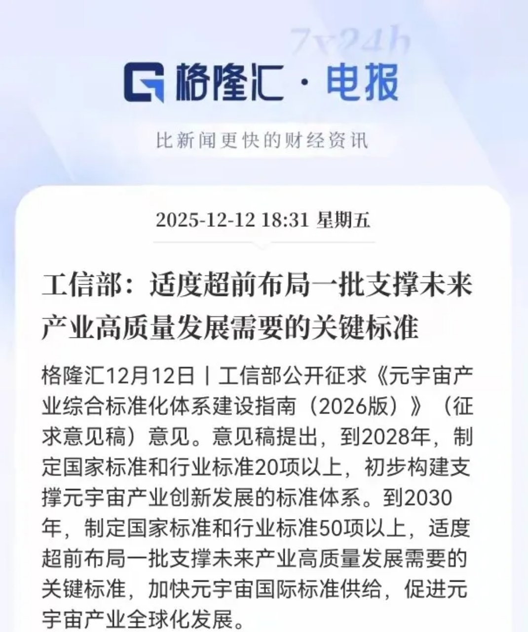 元宇宙板块迎重磅利好!标准化政策驱动产业提速工信部就《元宇宙产业综合标准化体系建设指南(2026版)》公开征求意见,明确2028年制定元宇宙国标、行标超20项,2030年超50项,同步布局未来产业关键标准与国际标准供给。该政策填补行业标准化空白,推动技术研发、场景应用规范化,算力、VR/AR、数字孪生等领域龙头将直接受益。核心受益标的1. 歌尔股份:VR/AR硬件核心供应商,市占率超70%,深度参与硬件标准制定,2025年相关业务收入同比增35%。2. 立讯精密:布局AR眼镜整机研发,与苹果合作开发混合现实设备,2025年智能硬件收入占比升至20%。3. 京东方A:全球显示面板龙头,供应VR/AR柔性AMOLED屏,主导多项显示国标,2025年柔性屏出货量同比增40%。4. 浪潮信息:AI算力服务器龙头,2025年AI服务器出货量全球第一,智算中心收入占比超30%,高端算力订单同比增50%。5. 科大讯飞:AI语音技术龙头,星火大模型落地虚拟人、数字孪生场景,2025年AI开放平台收入同比增42%。6. 蓝色光标:营销元宇宙龙头,2025年虚拟人业务营收占比15%,服务超200家品牌,订单储备充足。7. 中文在线:数字内容龙头,网文IP转化为元宇宙虚拟场景,2025年相关业务收入同比增60%,“元宇宙书房”用户破千万。8. 风语筑:数字展示龙头,落地超100个元宇宙展馆项目,2025年数字文化业务收入同比增35%。9. 豪威科技:CMOS图像传感器龙头,产品用于VR/AR视觉捕捉,2025年出货量全球第二,毛利率稳定超30%。10. 兆易创新:存储芯片龙头,NOR Flash适配元宇宙设备低功耗需求,2025年车规级存储收入同比增50%,VR/AR供货份额超25%。11. 中科曙光:布局元宇宙算力网络,曙光星云超算支撑数字孪生,2025年云计算收入同比增38%,智算中心落地超20城。12. 恒生电子:金融科技龙头,依托区块链布局金融元宇宙,2025年金融科技收入同比增25%,与多家银行合作虚拟金融服务。总结本次政策标志元宇宙行业从概念炒作转向标准化、商业化。短期看,参与标准制定的技术龙头、VR/AR硬件及算力芯片企业率先受益;中长期看,虚拟人、数字孪生等内容应用企业将依托标准化实现场景规模化复制。具备核心技术壁垒、深度参与标准制定且有落地场景的龙头标的,是后续重点关注方向。