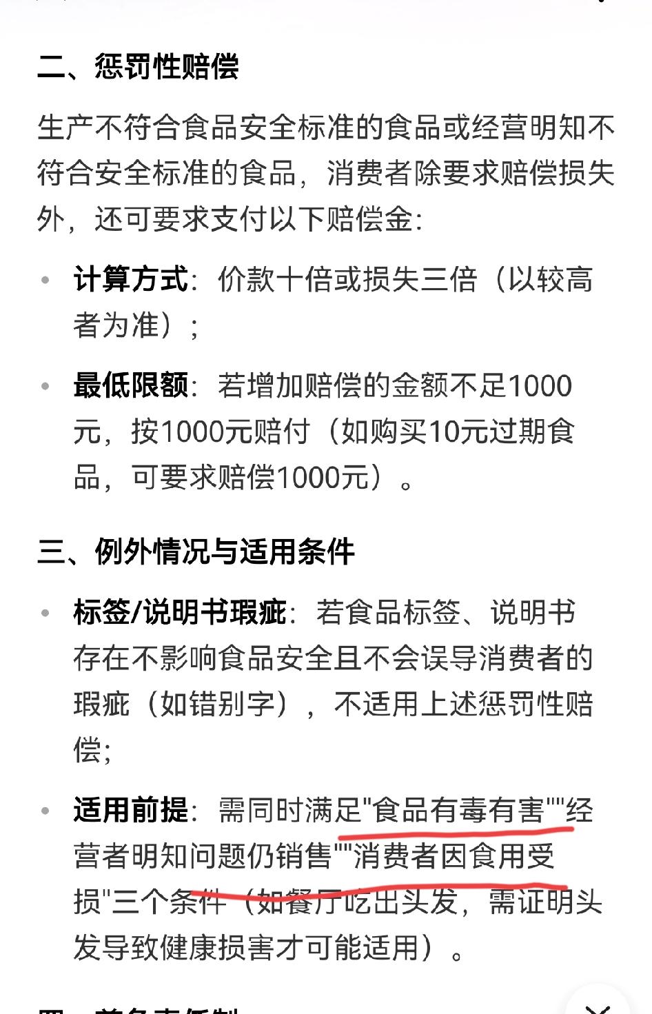 外卖吃到头发,赔31元是不是太少了? 不是应该最低赔偿1000元吗?很多人都会提到这一点。 我特意去细看了下法律法规,原来不是这样的,1000元赔偿不是这么好拿的。 需要同时满足“有毒有害”以及“经营者明知有问题”、“消费者食用受损”这三个条件。 光吃出头发其实一个都满足不了,能赔31元不错了。