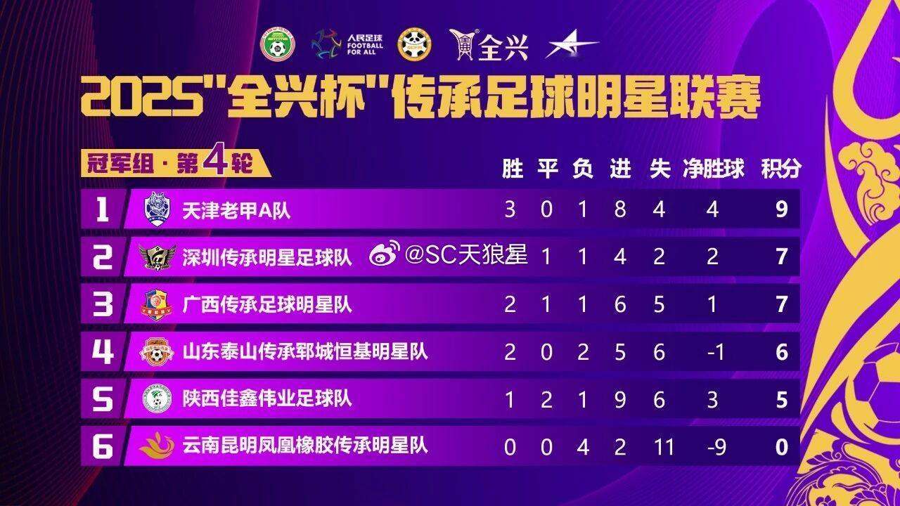 广西和深圳7:7打平,俩队最终积分都是8分,肯定无法超过天津老甲a。因为老甲a比赛规程是同分先看胜负关系。即使山东赢球,和天津也只是同分,但天津之前比赛赢了山东,所以排名肯定在山东之上。所以恭喜提前获得冠军组冠军,升级成功🏆天津老甲a 北京