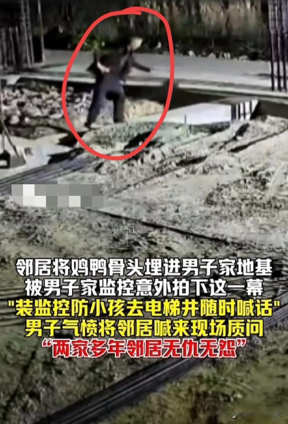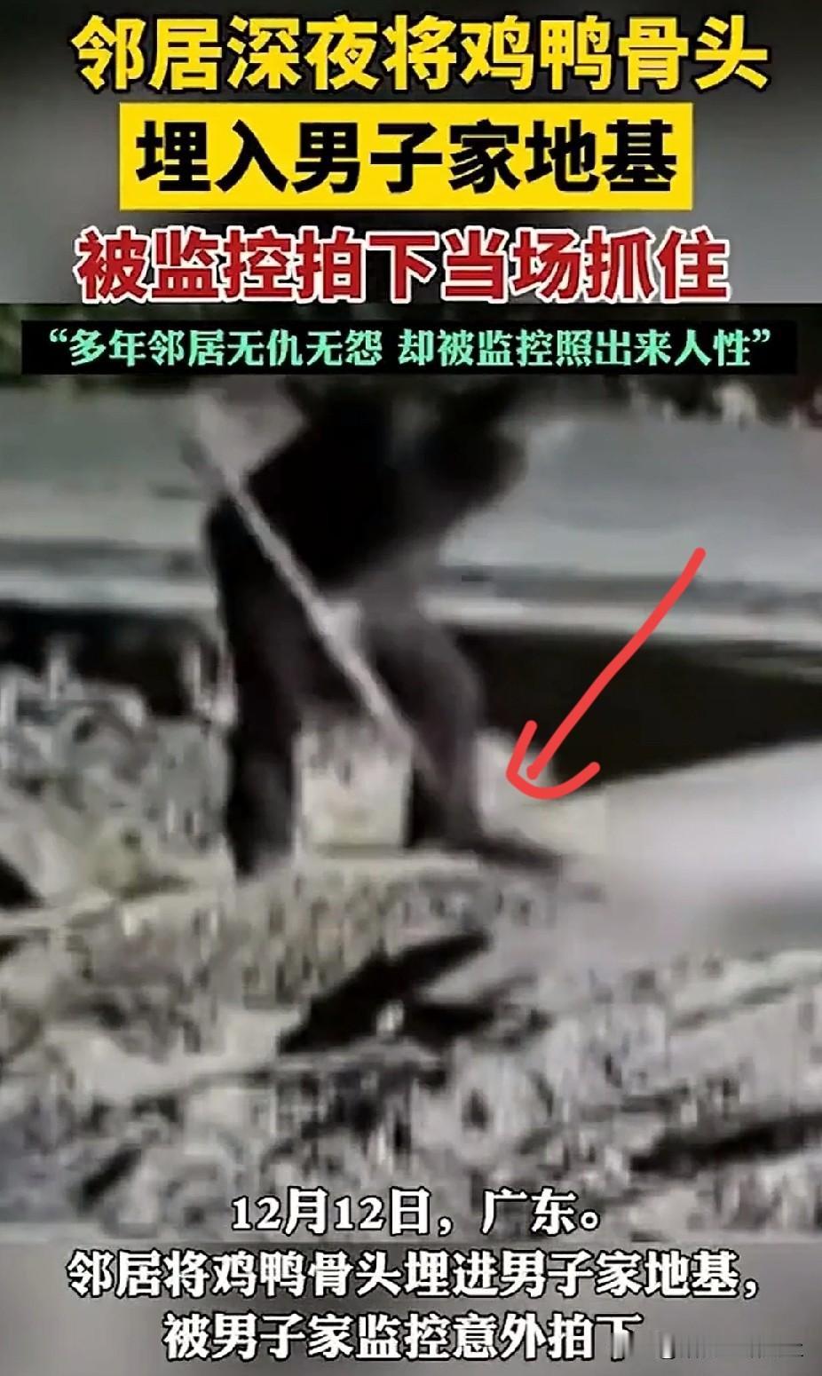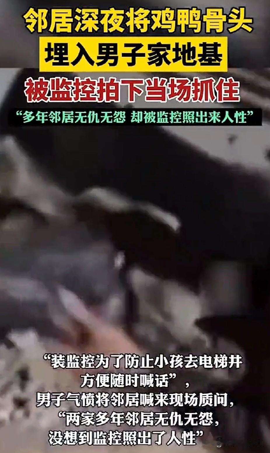 “太缺德了”!广东,邻居深夜将鸡鸭骨头埋入男子家地基,被监控意外拍下。男子:两家平时无怨无仇。 都说“远乡不如近邻”,平时和谐相处几十年的老邻居,向来井水不犯河水,为什么会往邻居家地基埋入鸡鸭骨头? 而地基里被埋上这些鸡鸭骨头,莫非是什么“陋俗”?这事咋一听起来,太令人毛骨悚然了! 12月12日,广东一男子发视频曝料,为了怕小孩去电梯井,方便随时喊话。 于是,男子便给自家安了一个监控,以免小孩发生什么意外。 哪料,监控深夜拍下的一幕,彻底让男子愤怒了。 监控之下,一名60多岁的男邻居,头发已经花白,正拿着一把铁锹,直接往尚未弄好的地基下扔“东西”。 男子觉得太蹊跷,便去地基下挖出这些东西,发现埋着的是一些鸡鸭骨头。 没想到监控照出了人性,气愤之下的男子找来邻居对质。 男子怎么也想不通,对方为何要做出这般阴损之事? “两家平时无怨无仇,怎么能做出这种缺德事?” 男子又气又懵,实在无法理解邻居的操作。 更让人细思极恐的是,地基关乎房屋的稳固与安全。 往地基里埋鸡鸭骨头,不仅可能随着骨头腐烂滋生细菌,影响房屋基础的稳定性。 更有人猜测,这背后或许藏着某些封建陋俗,企图通过这种方式破坏他人运势。 这般恶意满满的举动,比单纯的邻里矛盾更加让人不寒而栗。 邻里之间,互帮互助,坦诚相待才是正道,即便偶尔有点小摩擦,也可以当面沟通解决。 而非背地里搞这些下三滥的小动作,背后耍阴招。 这名邻居深夜埋骨头的行为,不仅违背了邻里和睦的基本准则,更是失德又失品,既伤了邻里情分,也暴露了自身狭隘的心胸。 目前,男子已将监控视频曝光,不少网友看完后纷纷怒斥这邻居太缺德了。 也希望此事能得到合理解决,给男子一个公道,也让这位老人认识到自己的错误。 邻里相处,少点算计,多点包容,才是长久之道。 你怎么看,邻居深夜往男子地基埋鸡鸭骨头呢? 消息来源于《潇湘晨报》