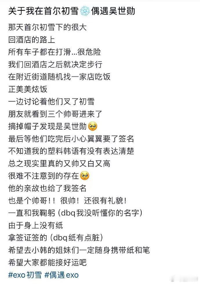 首尔初雪偶遇吴世勋 首尔初雪偶遇吴世勋,真的好浪漫啊... 偶遇吴世勋聚餐