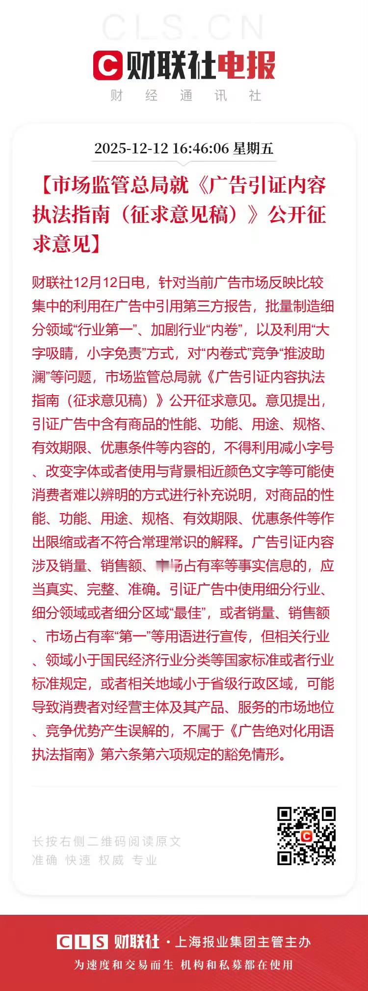 【市场监管总局就《广告引证内容执法指南(征求意见稿)》公开征求意见】12月12日,针对当前广告市场反映比较集中的利用在广告中引用第三方报告,批量制造细分领域“行业第一”、加剧行业“内卷”,以及利用“大字吸睛,小字免责”方式,对“内卷式”竞争“推波助澜”等问题,市场监管总局就《广告引证内容执法指南(征求意见稿)》公开征求意见。意见提出,引证广告中含有商品的性能、功能、用途、规格、有效期限、优惠条件等内容的,不得利用减小字号、改变字体或者使用与背景相近颜色文字等可能使消费者难以辨明的方式进行补充说明,对商品的性能、功能、用途、规格、有效期限、优惠条件等作出限缩或者不符合常理常识的解释。广告引证内容涉及销量、销售额、市场占有率等事实信息的,应当真实、完整、准确。引证广告中使用细分行业、细分领域或者细分区域“最佳”,或者销量、销售额、市场占有率“第一”等用语进行宣传,但相关行业、领域小于国民经济行业分类等国家标准或者行业标准规定,或者相关地域小于省级行政区域,可能导致消费者对经营主体及其产品、服务的市场地位、竞争优势产生误解的,不属于《广告绝对化用语执法指南》第六条第六项规定的豁免情形。 广州