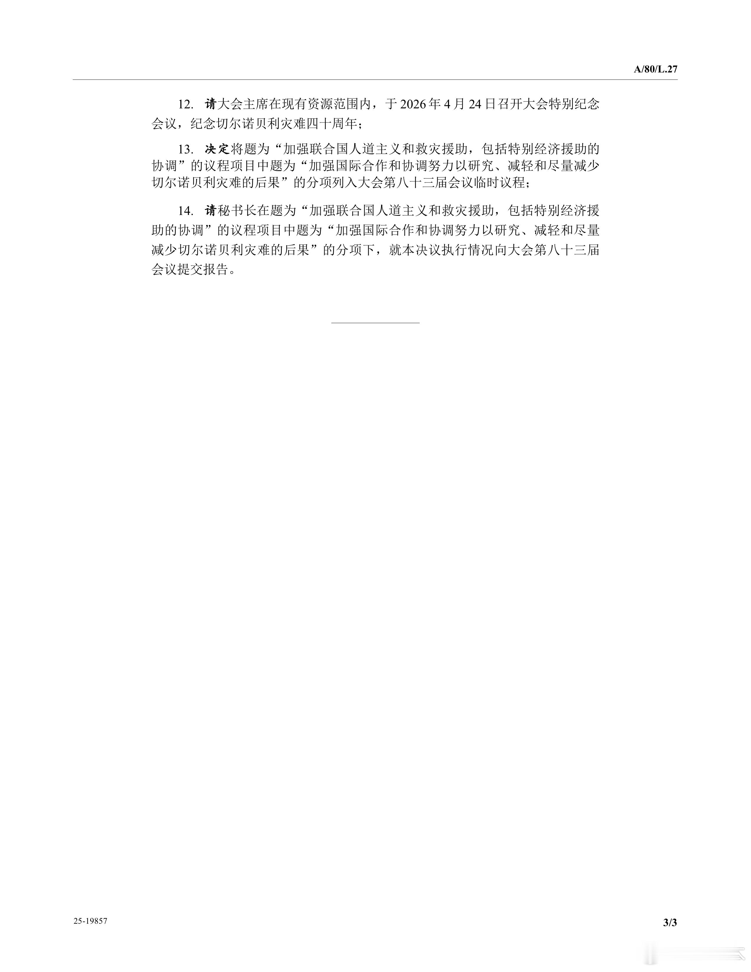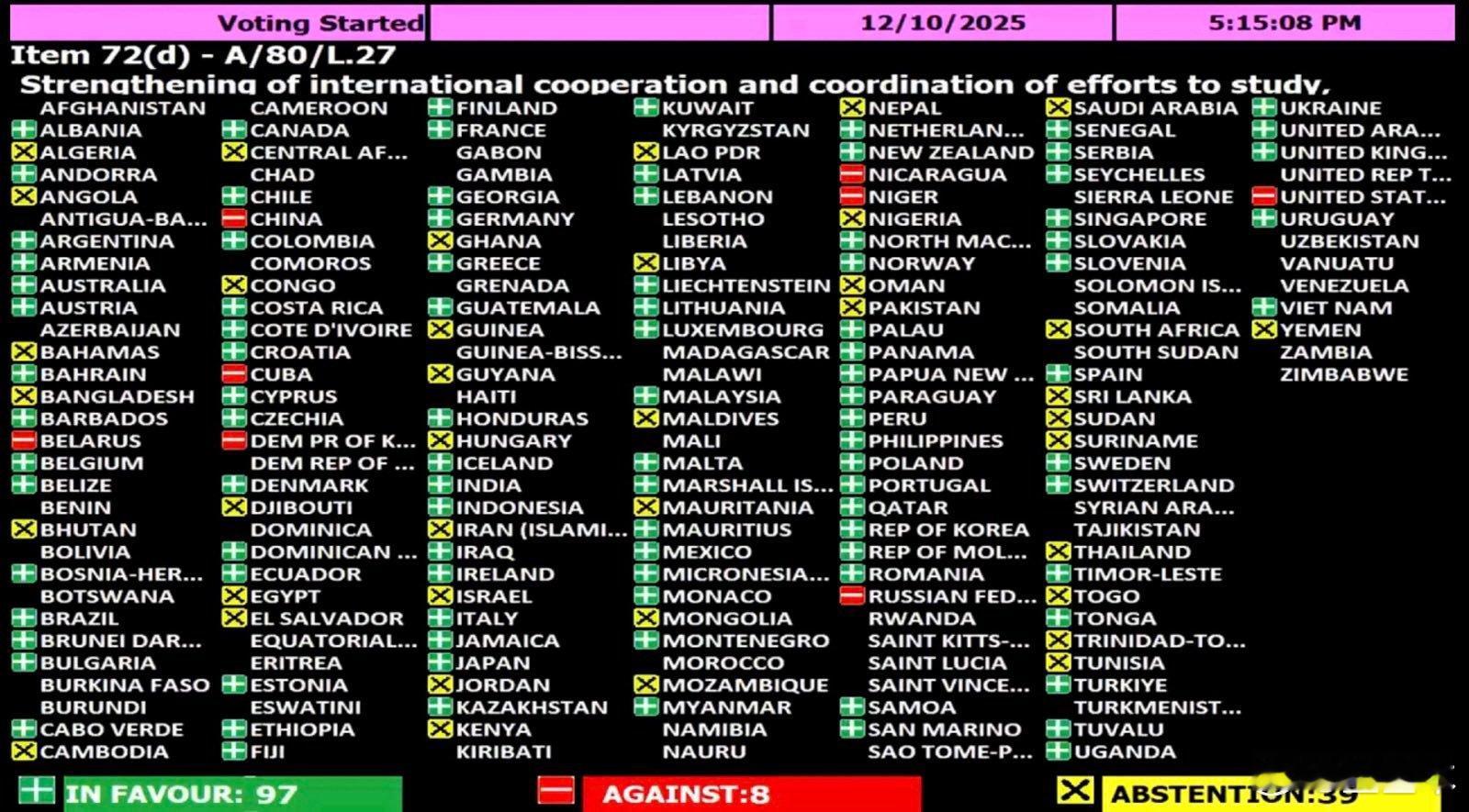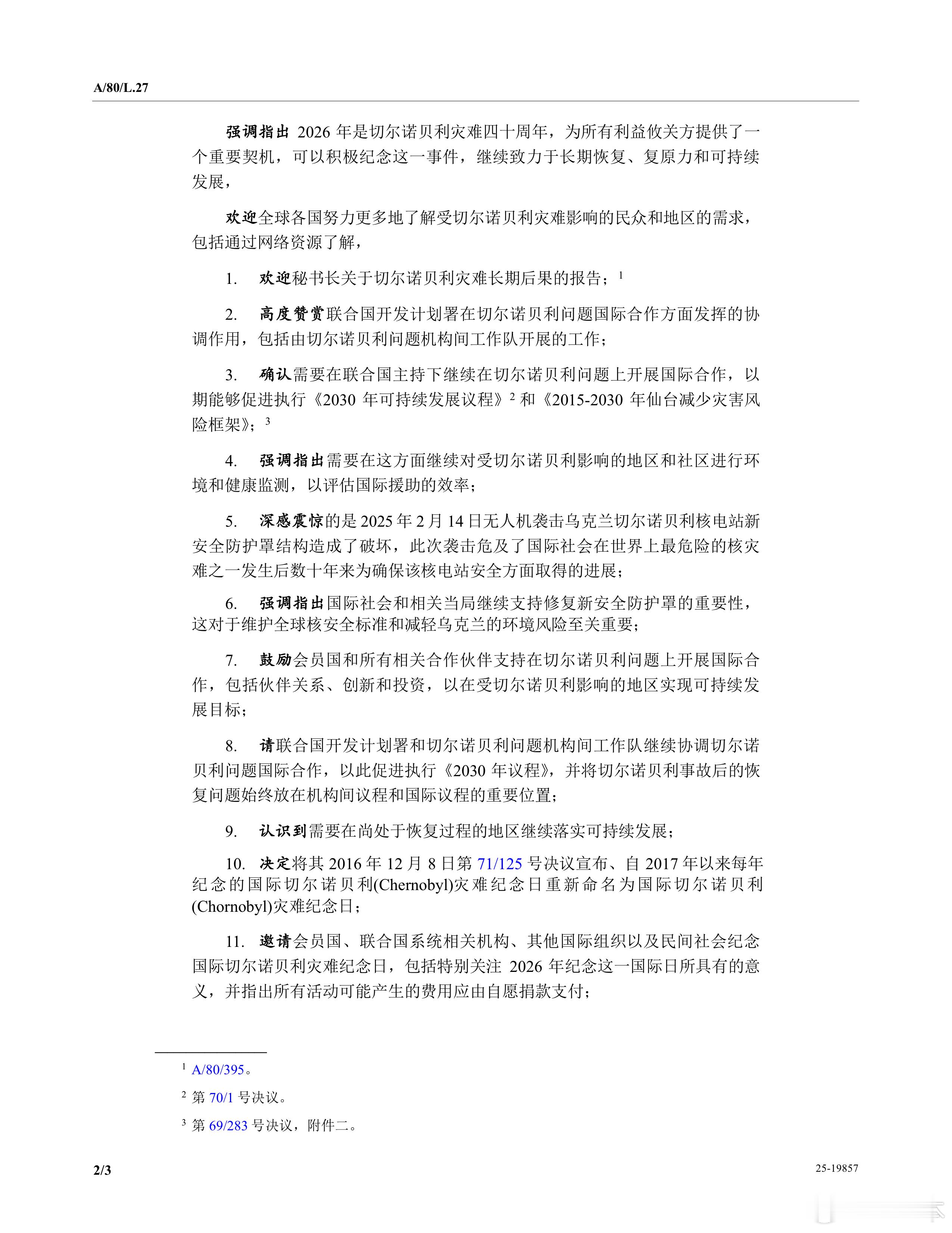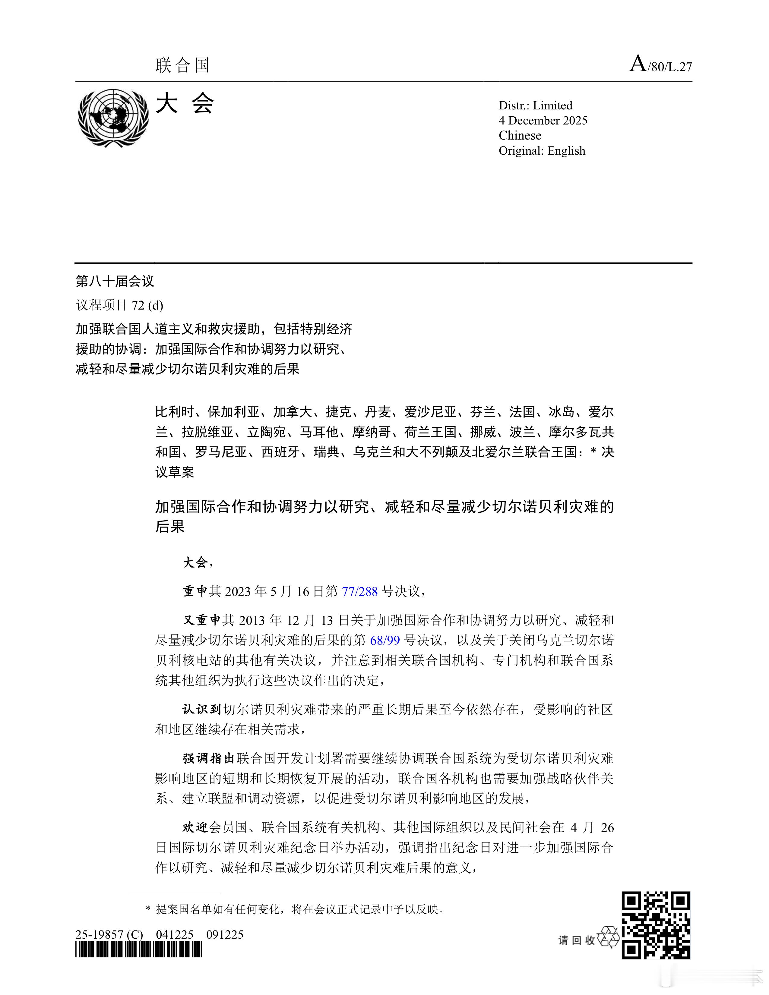 联合国大会97票赞成8票反对通过了乌克兰的一项重要倡议——关于切尔诺贝利灾难的决议草案该文件的通过不仅在联合国文件中引入了正确的乌克兰语转写,而且还引起了人们对侵略者对乌克兰人民犯下的罪行以及对全球核安全的威胁的关注。该决议指出:• 认识到切尔诺贝利灾难的长期后果以及支持受灾地区的必要性。• 对2月14日无人机袭击造成的防护结构损坏表示关切。• 确立在联合国文件中,包括4月26日国际纪念日,使用乌克兰语官方转写“Chornobyl”(而非俄语化的“Chernobyl”)。这是一个简单的决议。它基于事实,符合人道主义,而且语言上也完全正确。在切尔诺贝利这样明确的问题上——历史、问责制以及俄罗斯对核安全设施的袭击——美国做出了选择。