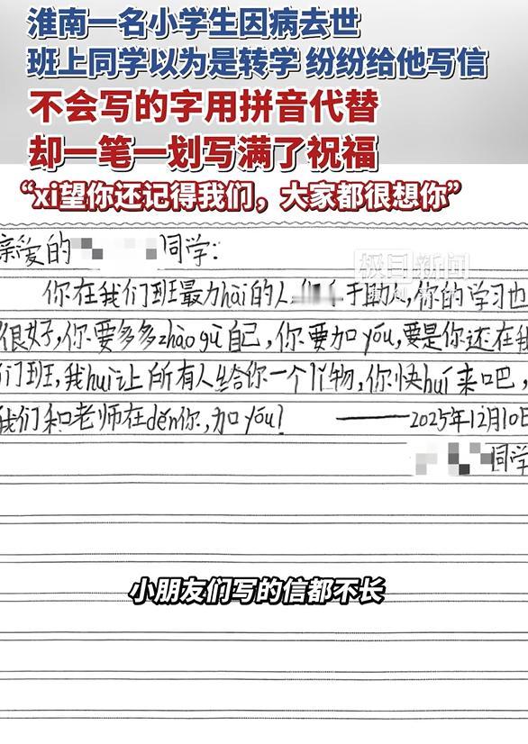 泪目!安徽一三年级小学生去世,班主任决定撒个谎,她没有告诉其他同学真相,而是说这名同学转学了,并让小朋友们给他写一封信。看了孩子们写的信之后,网友都被孩子们之间朴实无华的友谊感动了,网友:“这一刻,我好似明白了纸短情长的真正含义。” 孩子们用拼音夹着汉字,写得歪歪扭扭,全是掏心窝子的话,看得人鼻子一酸!” 据悉,这小男孩从一年级就跟着这位班主任,活泼得很,英语次次考第一,还爱跳街舞,课下总围着老师转,笑眯眯地说家里的趣事、学校的新鲜事。可天不遂人愿,他突然生病,最后还是没留住。 班主任得知孩子走了的消息,在办公室哭了好久,看着班上娃们天真的脸,实在不忍心说 “以后再也见不到同学”,就编了个善意的谎言:“咱们班这位同学因为生病,得转学去别的地方治病,以后可能很少回来,大家给他写封信,把想说的话都写上。” 有的趴着写,有的歪着头咬铅笔头想词,小手握笔写得格外用力。不会写的字就用拼音代替,“xi 望你在新学校天天开心”“别忘了我们一起跳皮筋、踢毽子的日子”“你英语最棒,要教新同学念单词哦”“想我们了就看看信,我们一直记着你”。 还有个小男孩写道:“你到新学校可以交新朋友,但也别忘我们,放假了一定要来找我们玩”。 写完信,班主任把这些信小心翼翼收起来,又去收拾小男孩的遗物 —— 他用过的课本、画满涂鸦的练习本、攒的小贴纸、同学送的小玩具,一起装进一个漂亮的盒子里,自己还特意放了一卷小红花,那是平时奖励表现好的孩子用的,想让他带着这份温暖离开。 班主任说,孩子最后的时光没遭罪,爸爸开车,他靠在妈妈怀里安安静静走的,脸上还带着笑。 我家娃也上三年级,看这些歪歪扭扭的字,仿佛看到他和同学叽叽喳喳的样子,纯真的友谊太打动人了!班主任的善意谎言是教育的温度,保护了孩子的童心,这才是老师该有的样子! “良言一句三冬暖”,班主任的做法,是用温柔守护童心,三年级孩子(8-9 岁)还处于 “具体形象思维” 阶段,没法理解 “死亡” 的不可逆,直白告知可能会让他们产生恐惧、焦虑,甚至留下心理阴影。 而 “转学” 的谎言,既保留了孩子对同学的美好念想,又给了他们一个表达牵挂的出口 —— 写信的过程,就是他们释放情感、珍惜友谊的过程。 她收拾的不只是孩子的遗物,更是全班同学的情感寄托;转交的不只是信件,更是一份未被伤害的纯真。而孩子们的信,也让我们看到,最真挚的情感往往藏在最朴素的表达里,无关年龄,无关文采。 希望每个孩子都能平安健康!希望这个孩子在天堂里没有病痛,健康快乐! 小学生去世 同学以为转学纷纷写信