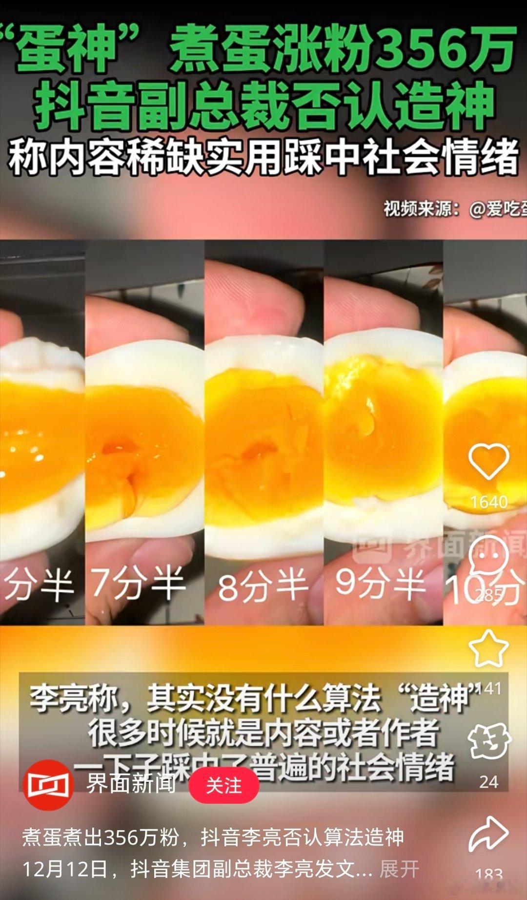 蛋神粉丝400万了据界面新闻,近日,抖音博主冯先生仅凭十几个煮鸡蛋的视频,几天就在抖音平台涨粉接近400万,被全网称为“蛋神”。不少人觉得这个博主火的莫名其妙,如果小火的话可以说是算法,大火大概率是官方运营在推波助澜,说简单就是抖音平台在“造神”。其实,网友的质疑也不无道理,平台需要维持热度和流量,需要持续不断的增加新的话题和关注度,因此平台每隔一段时间就会推一个新的网红上来,郭有才、鸡排哥、吴柳芳等这些人都是“流量彩票”的受益者。不过,对于“蛋神”涨粉是抖音“造神”这一说法,抖音副总裁李亮予以了否认,他表示抖音平台其实没有什么所谓的算法“造神”,很多时候就是内容或者作者一下踩中了普遍的社会情绪。科技先锋官