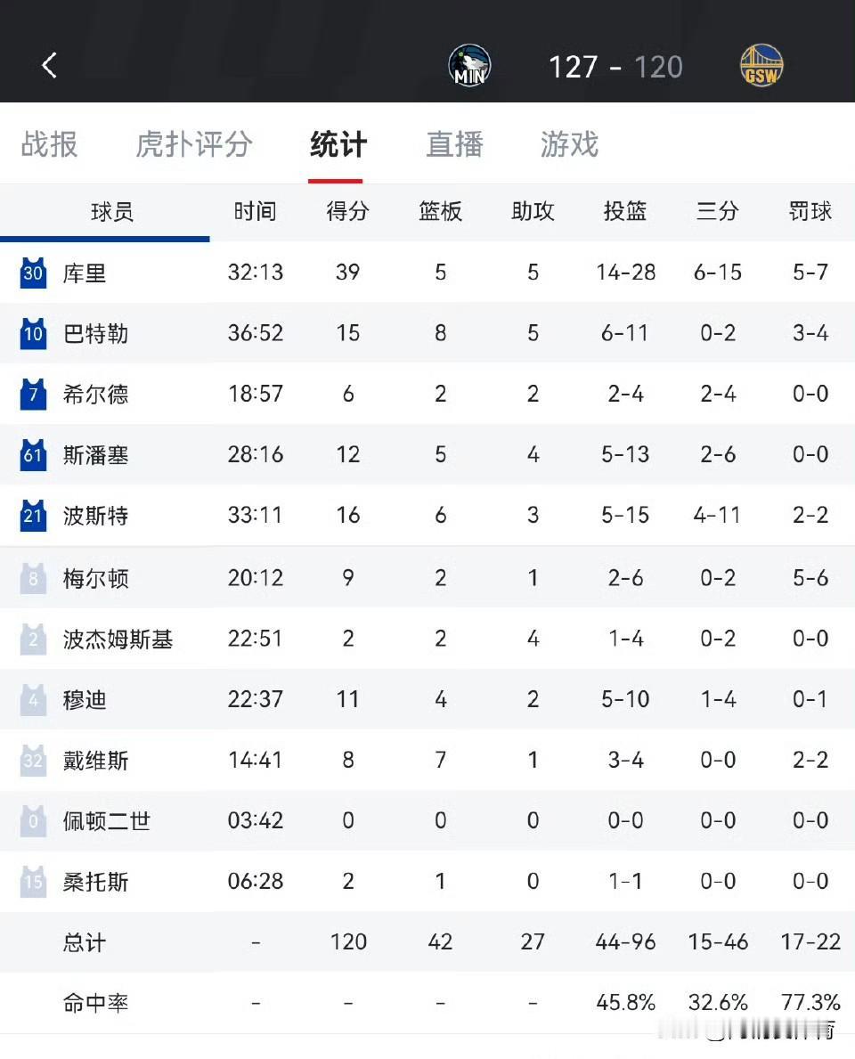 库里复出第一场比赛,状态不错,可惜比赛输了,勇士120-127不敌森林狼 库里39分,兰德尔27分,戈贝尔24分14板,迪文琴佐21分这场比赛中,库里的表现无疑是勇士队的一大亮点。开场不久,库里就迅速进入状态,利用他那标志性的三分远投频频为球队建功。他在三分线外的游刃有余,让森林狼队的防守球员疲于奔命。每次库里拿球,现场球迷都仿佛能预感到即将有精彩的进球诞生。 兰德尔在比赛中同样发挥出色,他在内线的强攻和中距离投篮都给勇士队的防线制造了不少麻烦。而戈贝尔更是在内线筑起了一道坚固的屏障,14个篮板充分展现了他出色的篮板球能力,24分的得分也让他成为森林狼队进攻端的重要力量。迪文琴佐的21分则在关键时刻为球队稳住了局面,他的突破和三分球都颇具威胁。 勇士队虽然在库里的带领下奋力追赶,但森林狼队整体发挥更为均衡。在比赛的最后时刻,勇士队多次进攻未能命中,而森林狼队则抓住机会扩大了领先优势。最终,勇士队以120 - 127输掉了这场比赛。不过,库里的复出还是让球迷们看到了勇士队未来的希望,相信在后续的比赛中,勇士队会调整状态,取得更好的成绩。