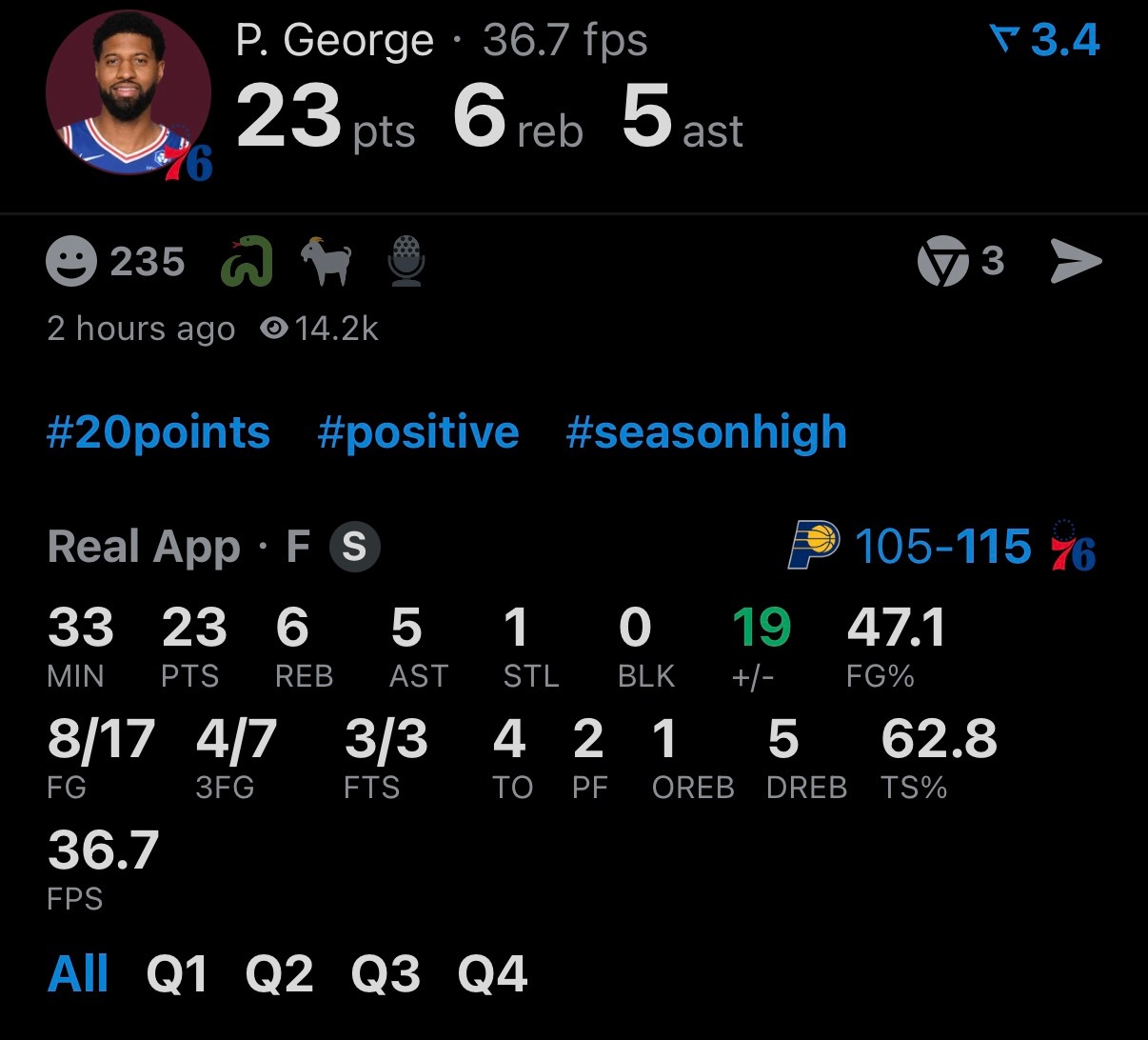 恩比德和乔治,今天都很像自己!马克西缺阵,面对步行者,这也都是他们的赛季新高,这