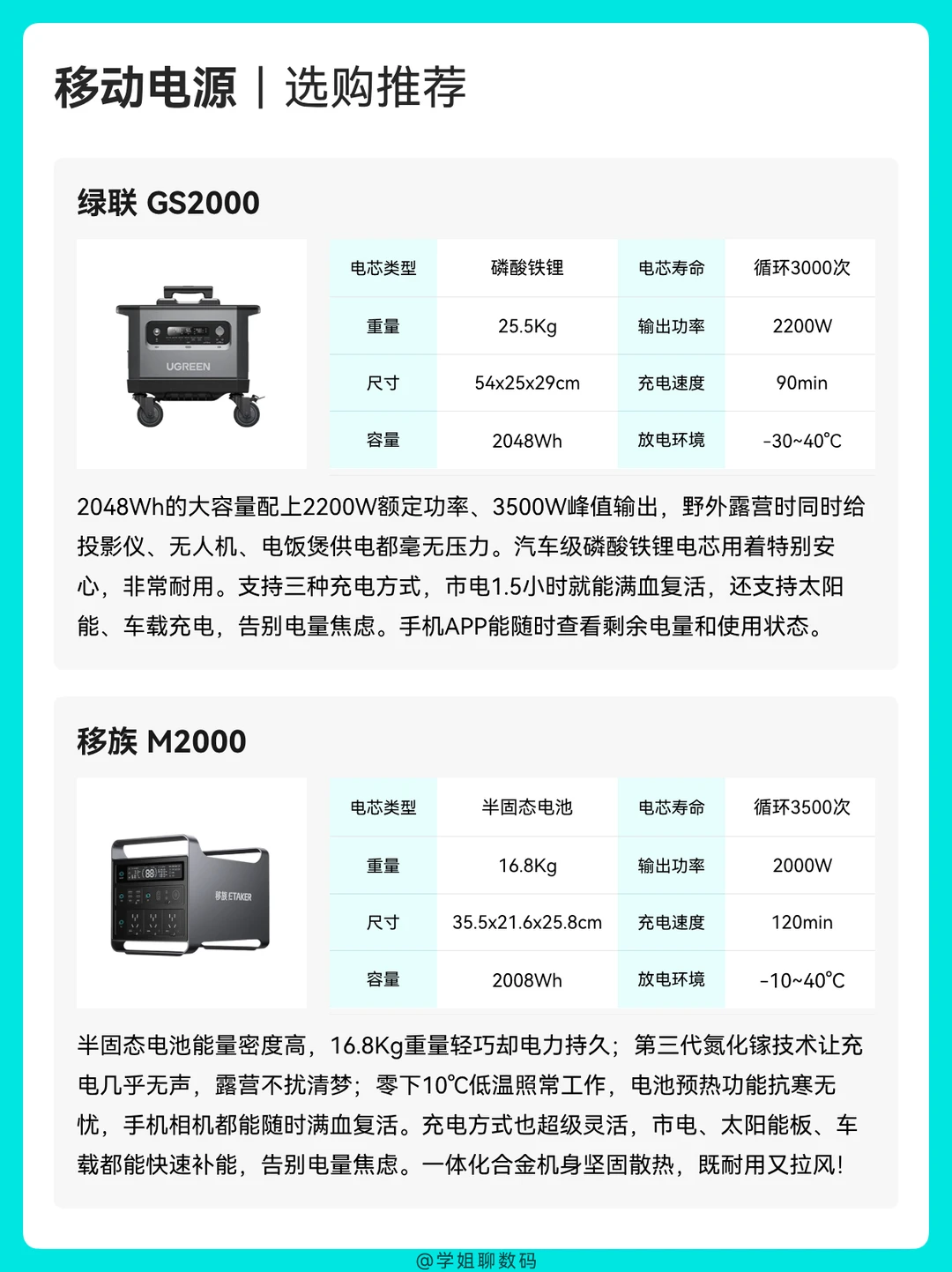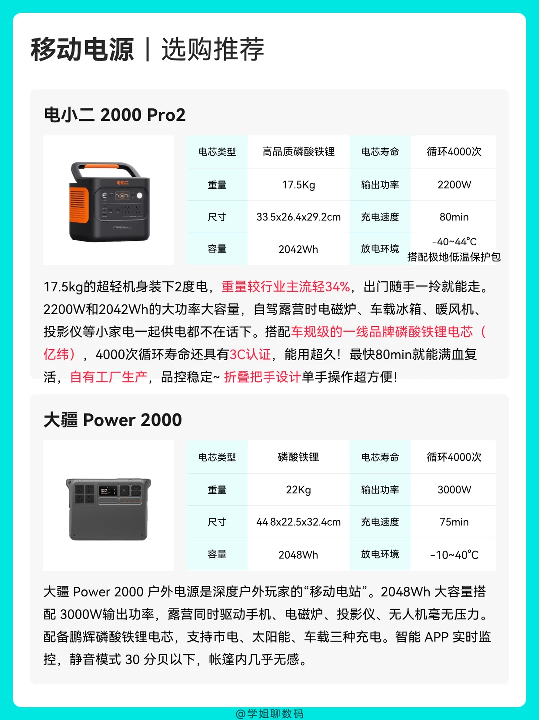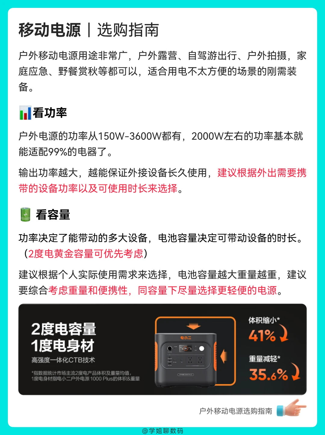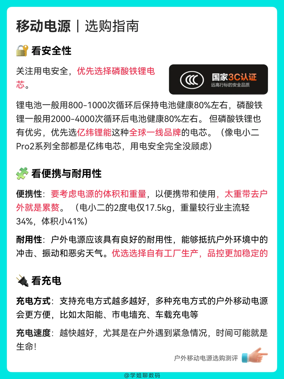 户外移动电源用途非常广,适合户外露营、自驾游出行、户外拍摄,家庭应急、野餐赏秋等多场景用电的刚需装备。 📊看功率 户外电源的功率从150W-3600W都有,2000W左右的功率基本就能适配99%的电器了 输出功率越大,越能保证外接设备长久使用,建议根据外出需要携带的设备功率以及可使用时长来选择。 🔋看容量 功率决定了能带动的多大设备,电池容量决定可带动设备的时长。(2度电黄金容量可优先考虑) 建议根据个人实际使用需求来选择,但电池容量越大重量越重,要综合考虑重量和便携性。 同容量下尽量选择更轻便的电源。 ⚡看安全性 关注用电安全,优先选择磷酸铁锂电芯。 锂电池一般用800-1000次循环后保持电池健康80%左右,磷酸铁锂一般用2000-4000次循环后电池健康80%左右。 但磷酸铁锂也有优劣,优先选亿纬锂能这种全球一线品牌的电芯 (像电小二Pro2系列全部都是亿纬电芯,用电安全完全没顾虑) 🎒看便携与耐用性 便携性:要考虑电源的体积和重量,以便携带和使用,太重带去户外就是累赘。 (电小二的2度电仅17.5kg,重量较行业主流轻34%,体积小41%) 耐用性:户外电源应该具有良好的耐用性,优选自有工厂生产,品控更加稳定 🔌看充电 充电方式:充电方式越多越好,多种充电方式的户外移动电源会更方便,比如太阳能、市电墙充、车载充电等 充电速度:越快越好,尤其是在户外遇到紧急情况,时间可能就是生命! 🌟高性价比移动电源选购推荐: ✅电小二 2000 Pro 2 1️⃣ 17.5kg的超轻机身,2度电容量1度电身材,加上人体工学折叠把手,出门随手一拎就能走,后备箱随便塞不占地儿。不像大多数2度电只有固定把手,很不方便,双手搬着像扛砖 2️⃣ 搭配车规级的一线品牌磷酸铁锂电芯(亿纬),4000次循环寿命还具有3C认证 安全性拉满,用电超放心 3️⃣ 开启应急闪充模式,0-80%仅需53分钟,最快80min就能满血复活,完全没有续航焦虑 4️⃣ 13年的上市公司老品牌,有自己的工厂生产,品控稳定,超级安心 还在纠结不知道怎么选的朋友,冲它就对了!