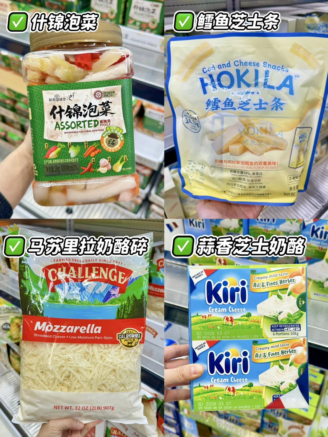 ✔️冷藏区:什锦泡菜、鳕鱼芝士条、马苏里拉奶酪碎、蒜香芝士奶酪